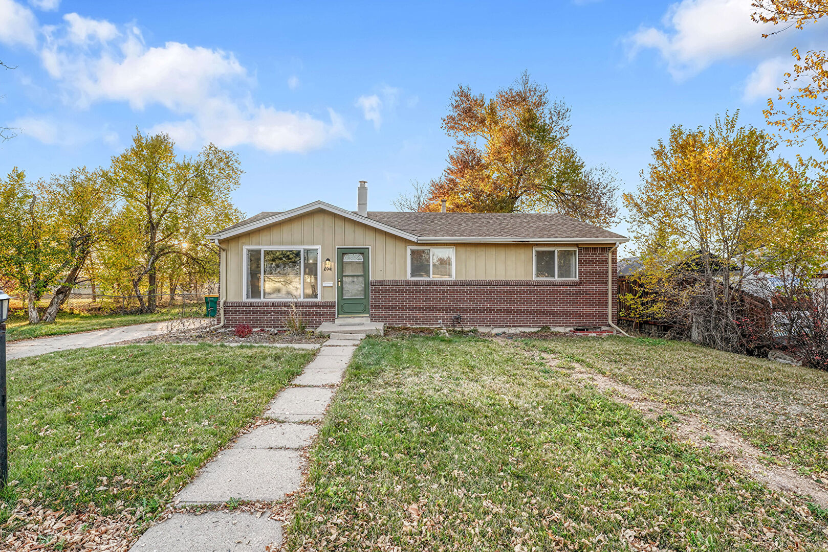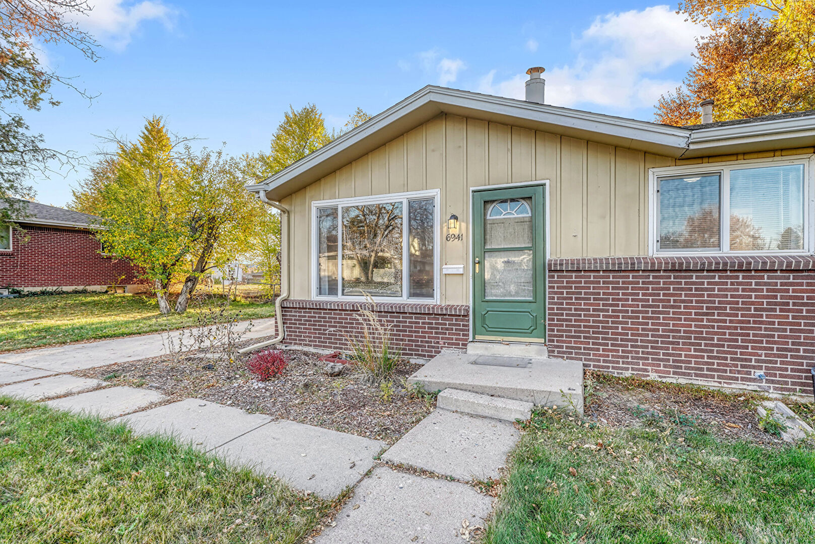 Board Batten Siding, Brick Siding, Concrete Foundation, Downspout, Lawn, Stoop, Vertical Siding, Gutters