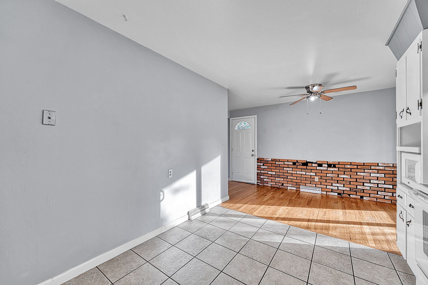 Ceiling Fan, Drywall, L Shaped Kitchen, Natural Light, Tile Floor, Visible Hinge Cabinets, Wood Finish Floor, Baseboards Wall, Wainscot Wall