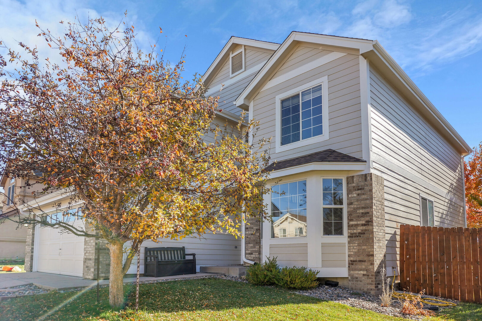 Brick Siding, Built In Garage, Central Ac, Concrete Foundation, Downspout, Driveway, Fence, Garage, Gutters, Horizontal Siding, Shingle Roof, Gutters, Lawn, Shingle Roof