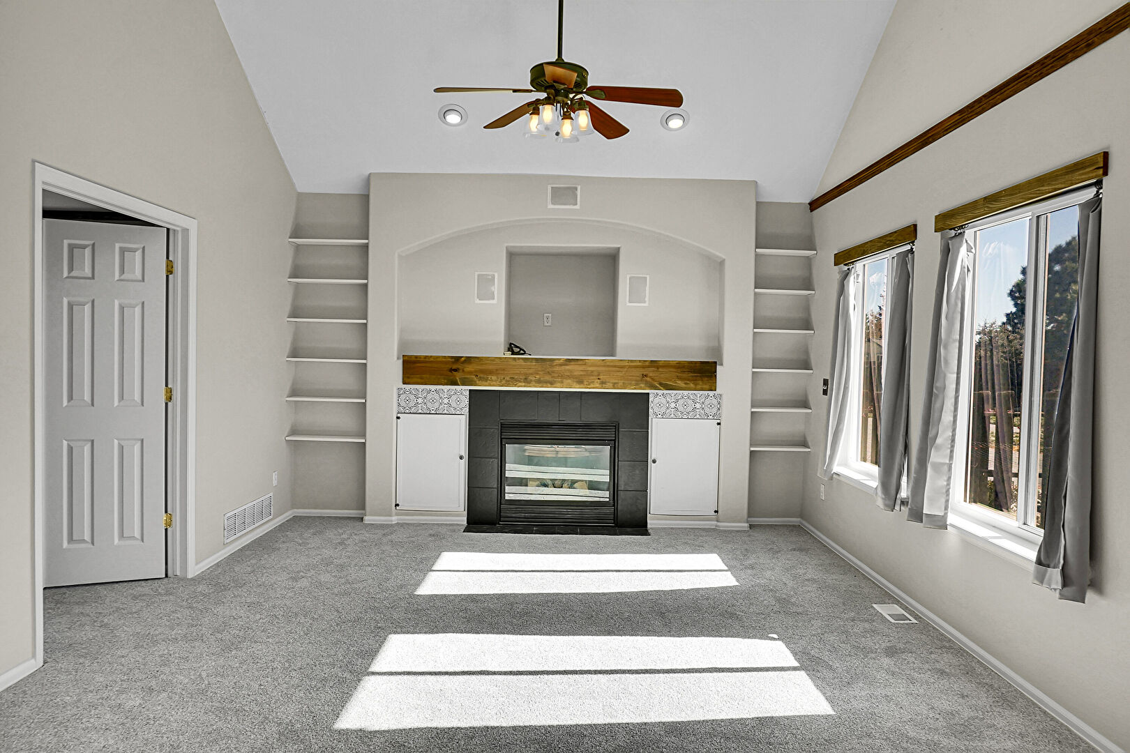 Baseboards Wall, Built In Shelves, Carpet, Ceiling Fan, Drywall, Fireplace, Glass Insert Cabinets, High Ceiling, Kitchen Peninsula, Natural Light, Opens To Living Area, Pendant Lighting, Recessed Lighting, Vaulted Ceiling, Vent, Wood Finish Floor, Carpet, Natural Light, Vaulted Ceiling