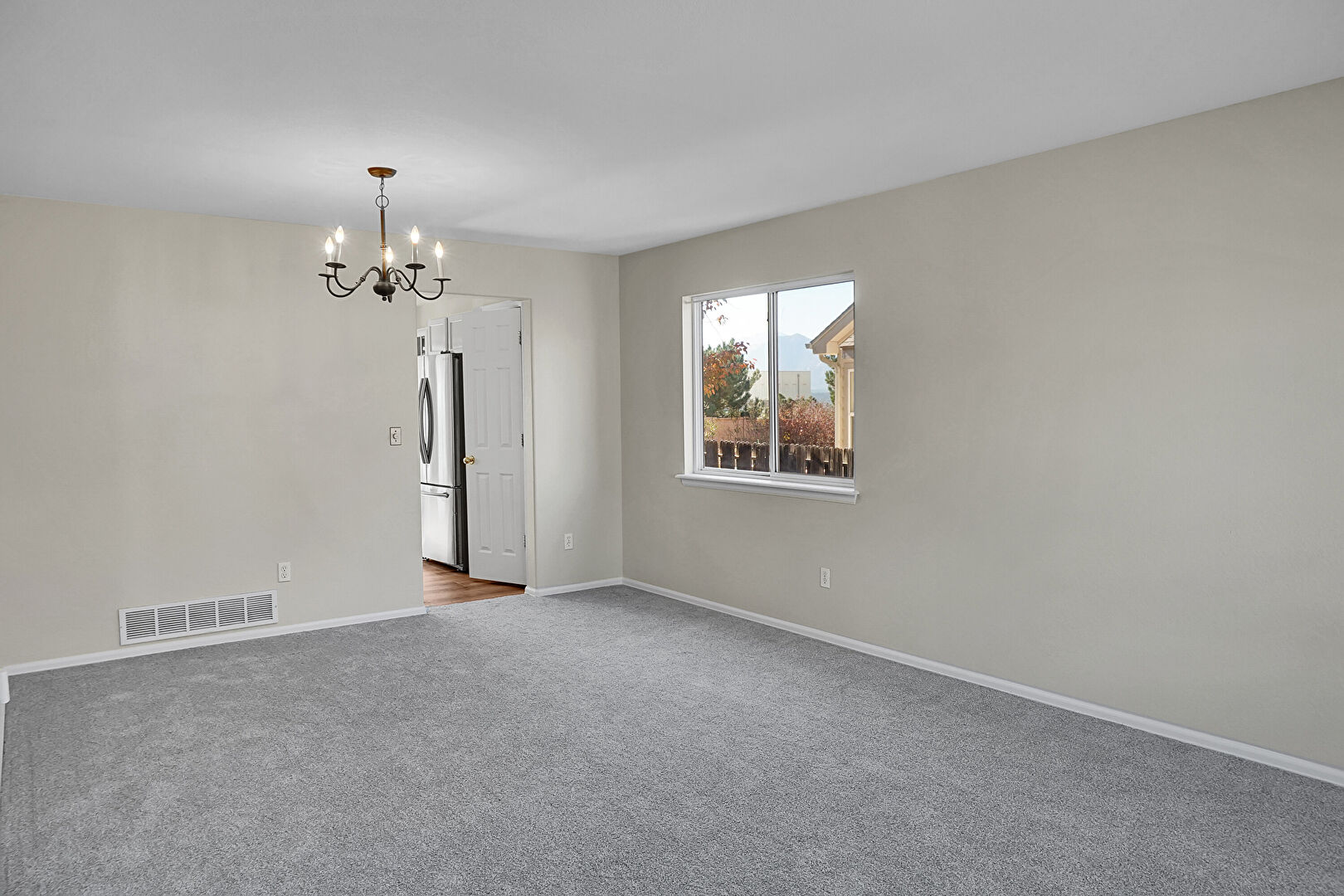 Baseboards Wall, Carpet, Drywall, Natural Light, Notable Chandelier, Vent, Carpet, Notable Chandelier