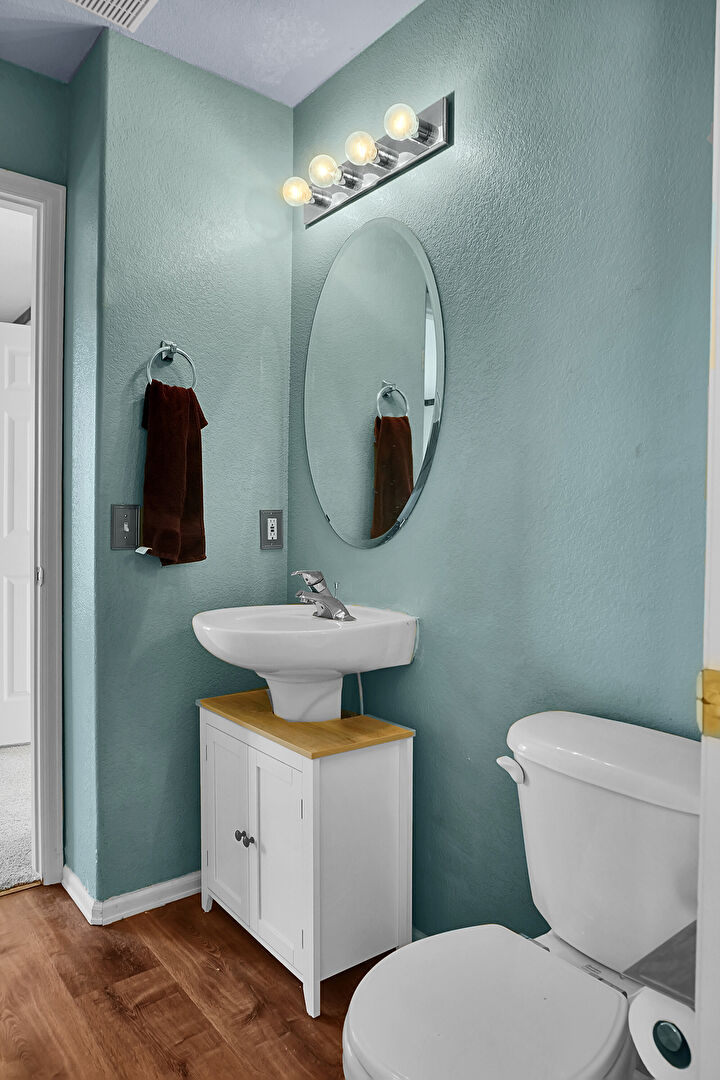 Baseboards Wall, Half Bathroom, Textured Ceiling, Textured Wall, Vanity, Vent, Wood Finish Floor, Textured Wall, Wood Finish Floor