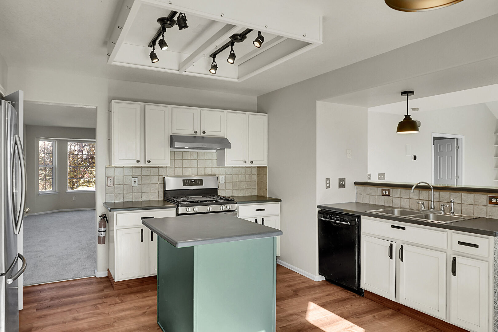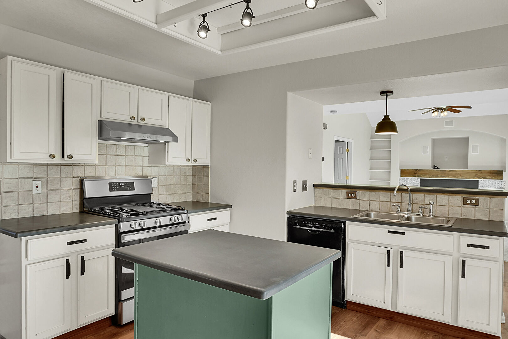 Baseboards Wall, Ceiling Fan, Drywall, Fire Extinguisher, Glass Insert Cabinets, Green Cabinets, Kitchen Island, Kitchen Peninsula, Natural Light, Pass Through Window, Pendant Lighting, Shaker Cabinets, Stainless Steel Countertops, Toaster, Track Lighting, Tray Ceiling, Wood Finish Floor, Drywall, Pendant Lighting, Vent, Wood Finish Floor