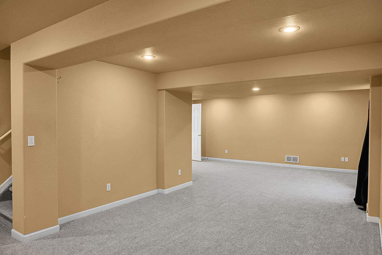 Baseboards Wall, Basement, Carpet, Drywall, Recessed Lighting, Stairs, Textured Ceiling, Basement, Carpet, Vent