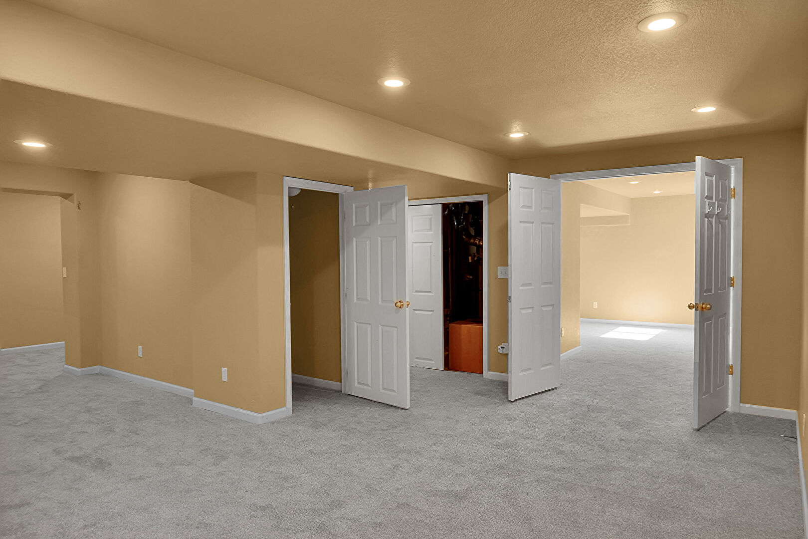Baseboards Wall, Basement, Carpet, Drywall, Recessed Lighting, Textured Ceiling, Natural Light, Vent