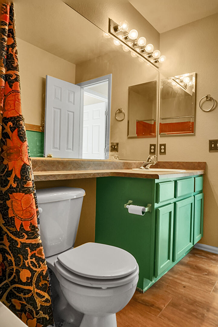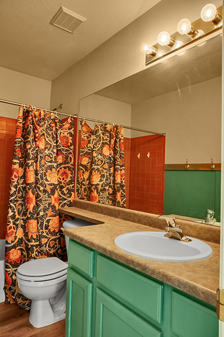 Baseboards Wall, Combined Bath Shower, Drywall, Full Bathroom, Textured Ceiling, Vanity, Vent, Wood Finish Floor, Drywall, Full Bathroom, Wood Finish Floor