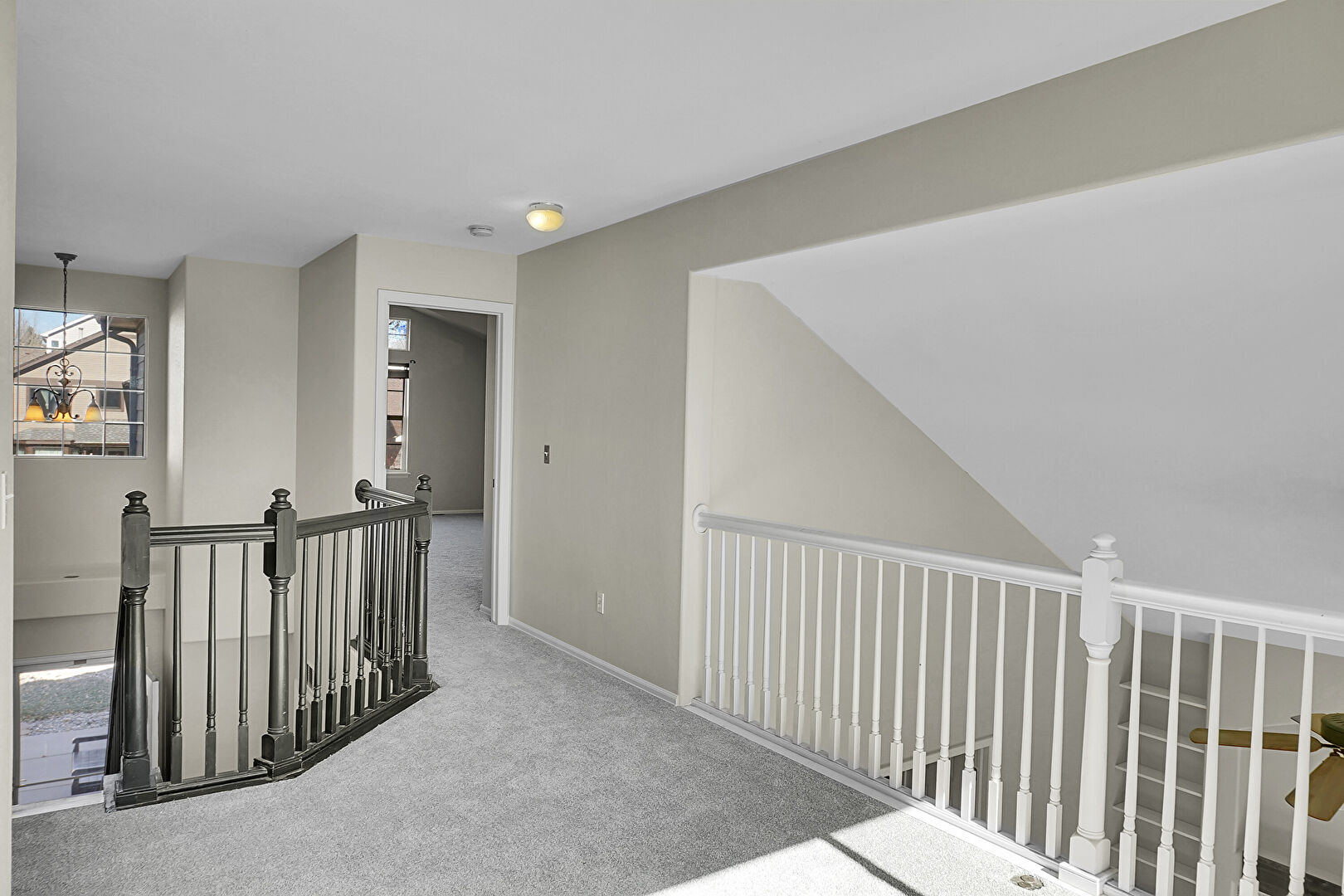 Baseboards Wall, Carpet, Drywall, Loft, Natural Light, Notable Chandelier, Upstairs Landing, Vent, Baseboards Wall, Carpet