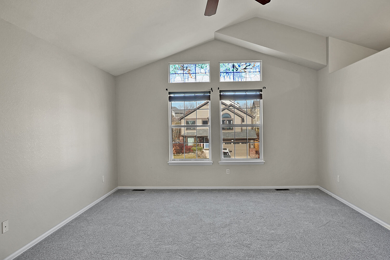 Baseboards Wall, Carpet, Cathedral Ceiling, Ceiling Fan, Drywall, Ensuite Bathroom, High Ceiling, Natural Light, Vanity, Vaulted Ceiling, Vent, Baseboards Wall, Carpet, Drywall, Textured Ceiling, Vent