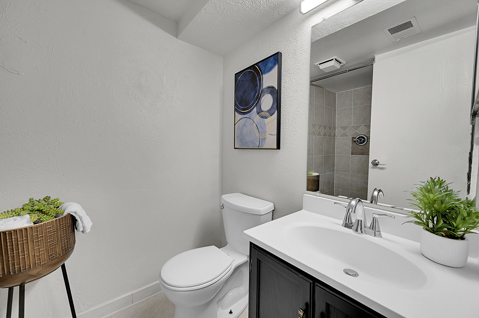 Baseboards Wall, Carpet, Combined Bath Shower, Drywall, Full Bathroom, Textured Wall, Vanity, Vent, Full Bathroom, Textured Ceiling