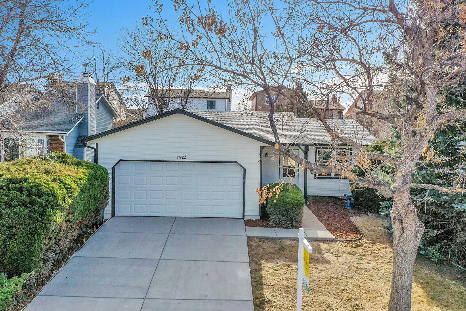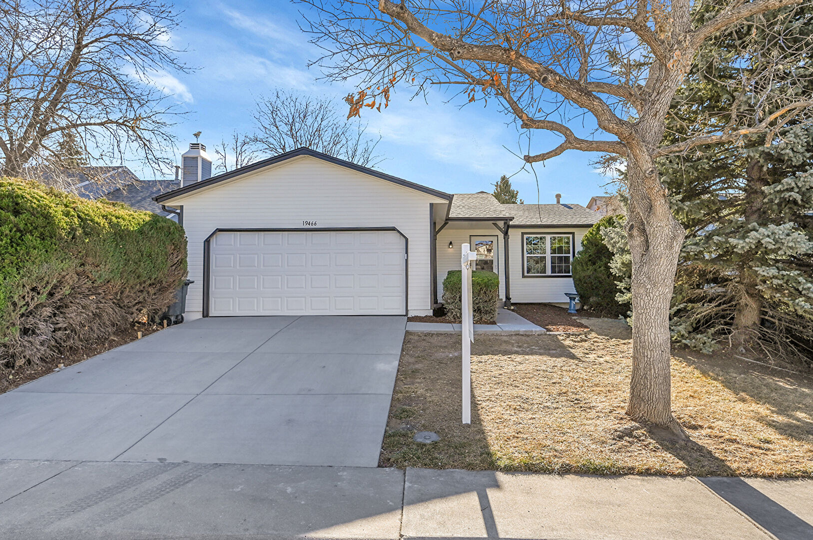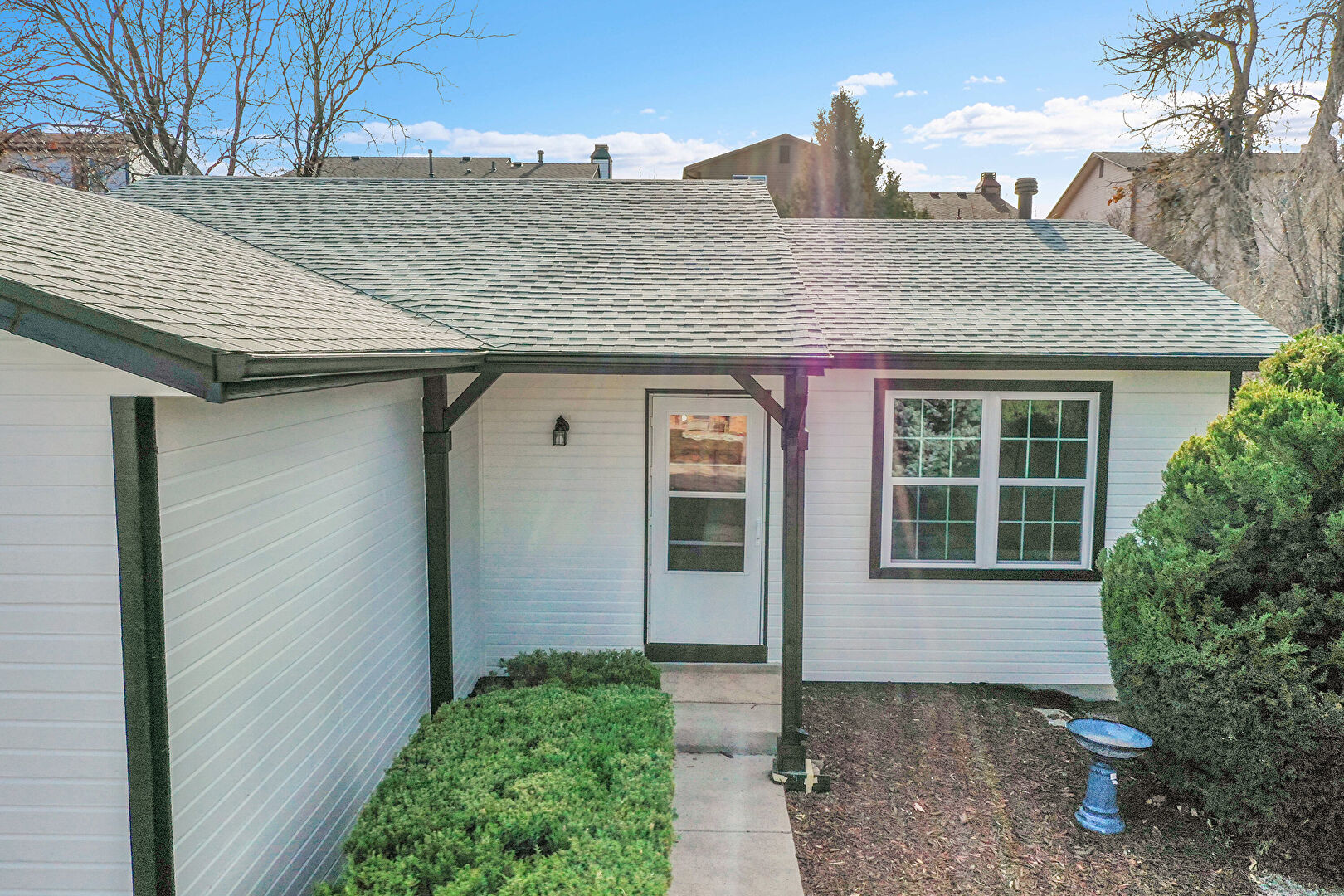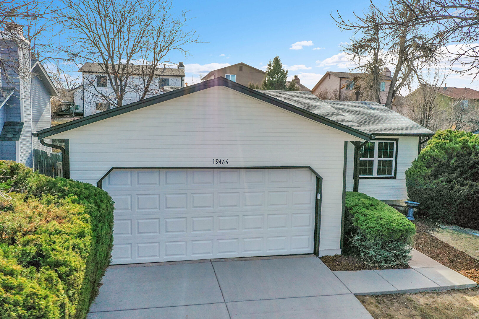 Concrete Foundation, Downspout, Driveway, Gutters, Horizontal Siding, Shingle Roof