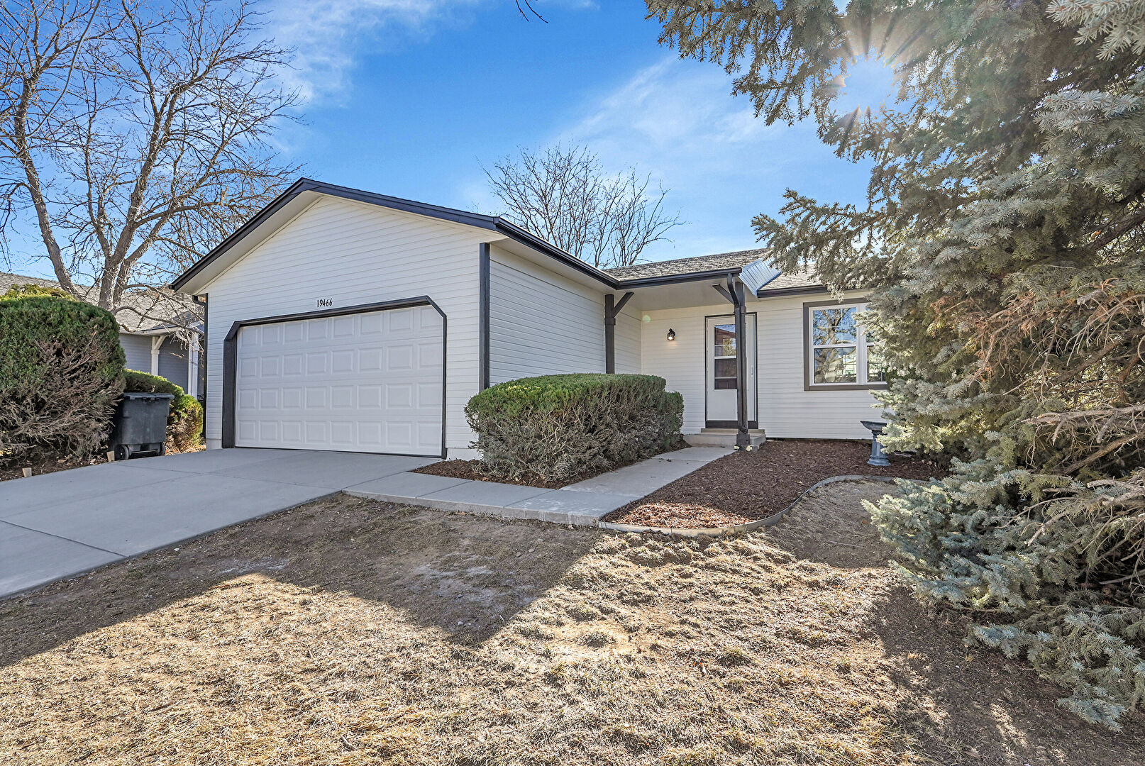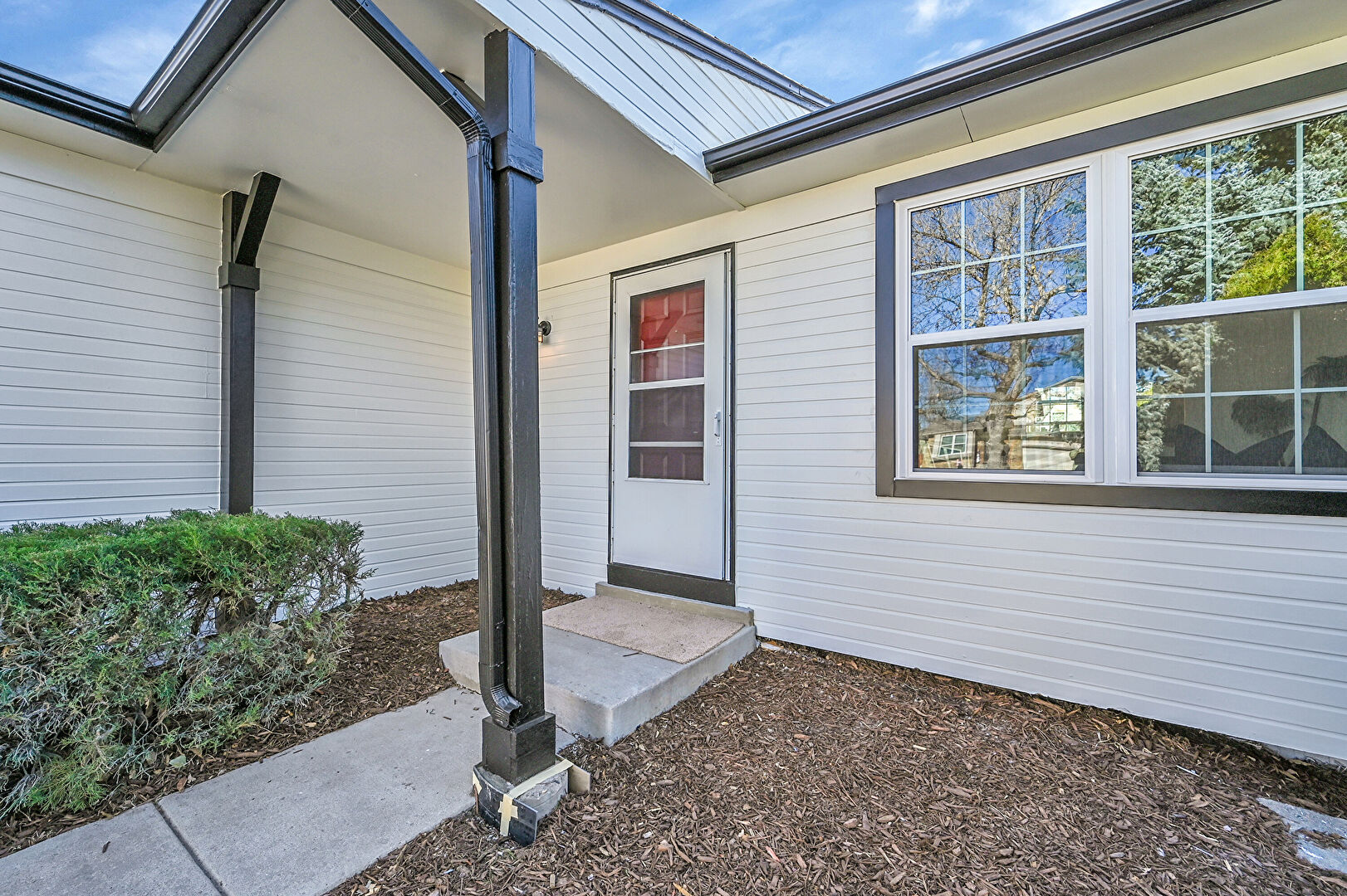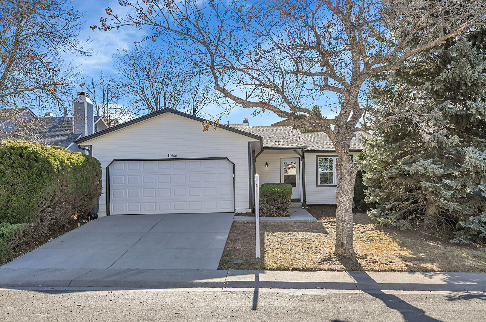 Concrete Foundation, Downspout, Driveway, Gutters, Horizontal Siding, Shingle Roof