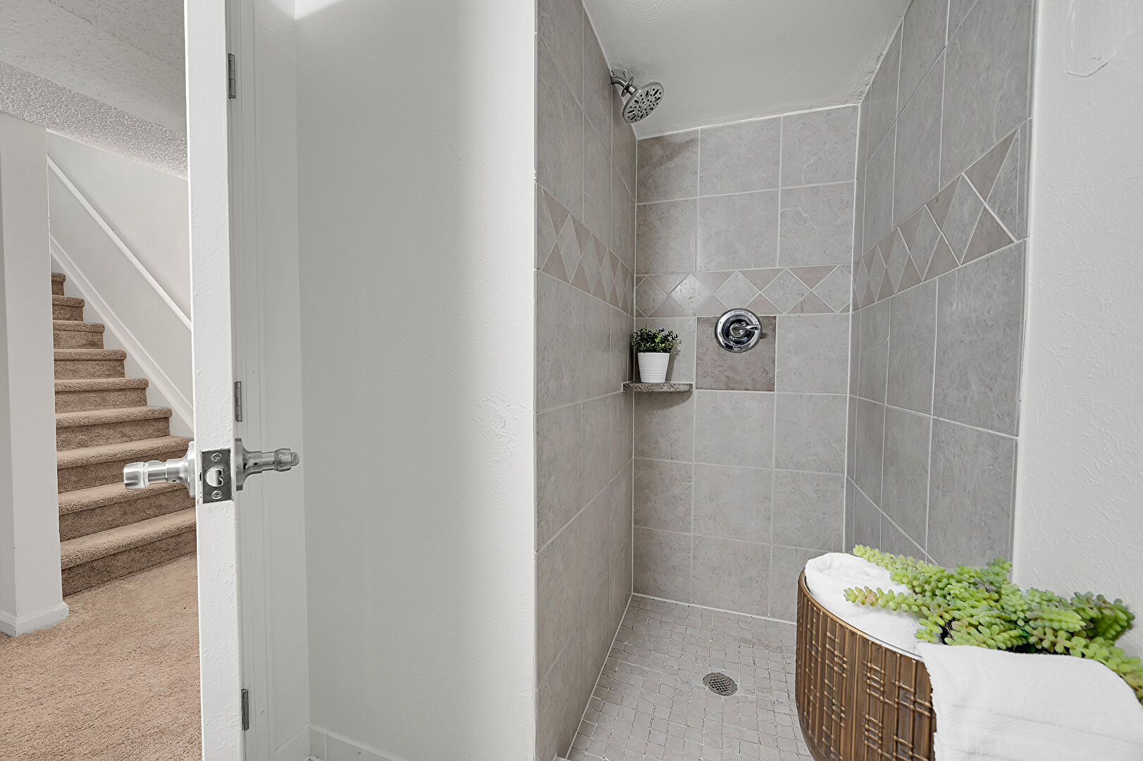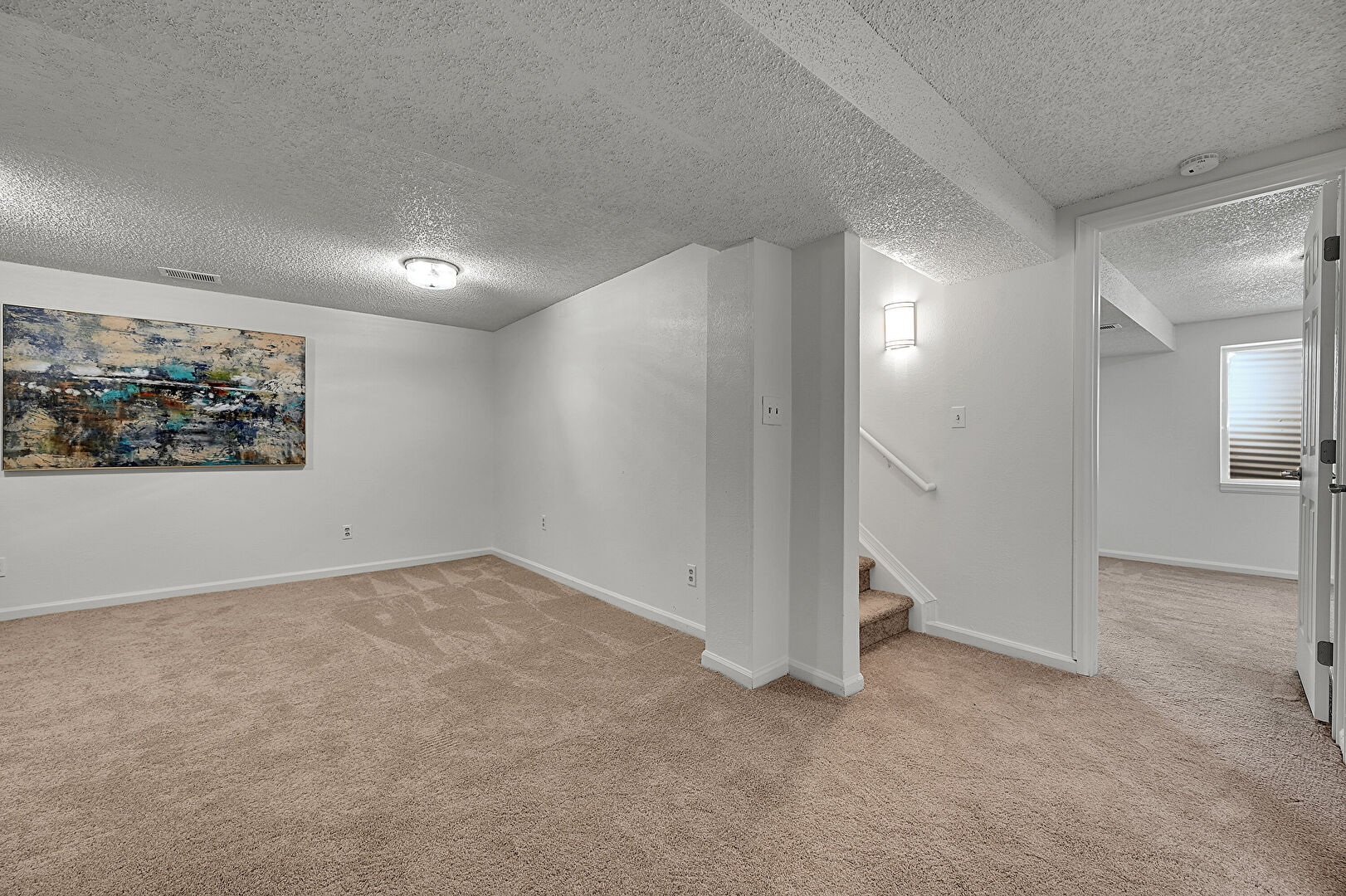 Baseboards Wall, Basement, Drywall, Smoke Carbon Monoxide Detector, Stairs, Textured Ceiling, Vent, Carpet