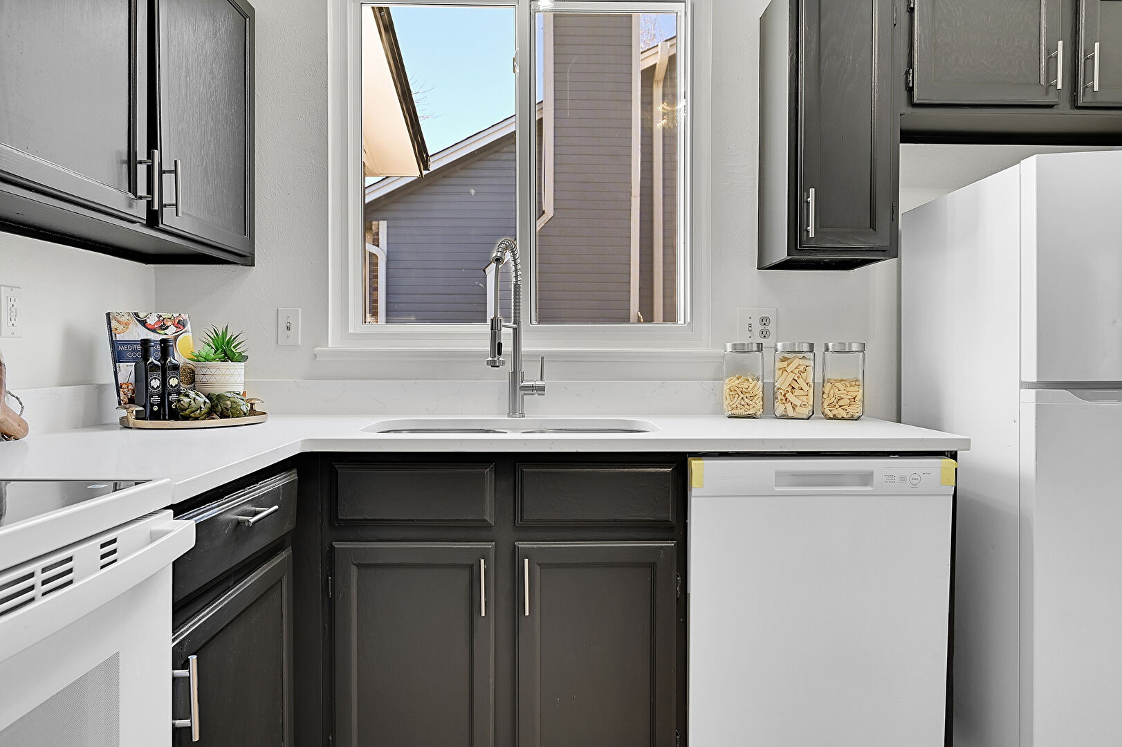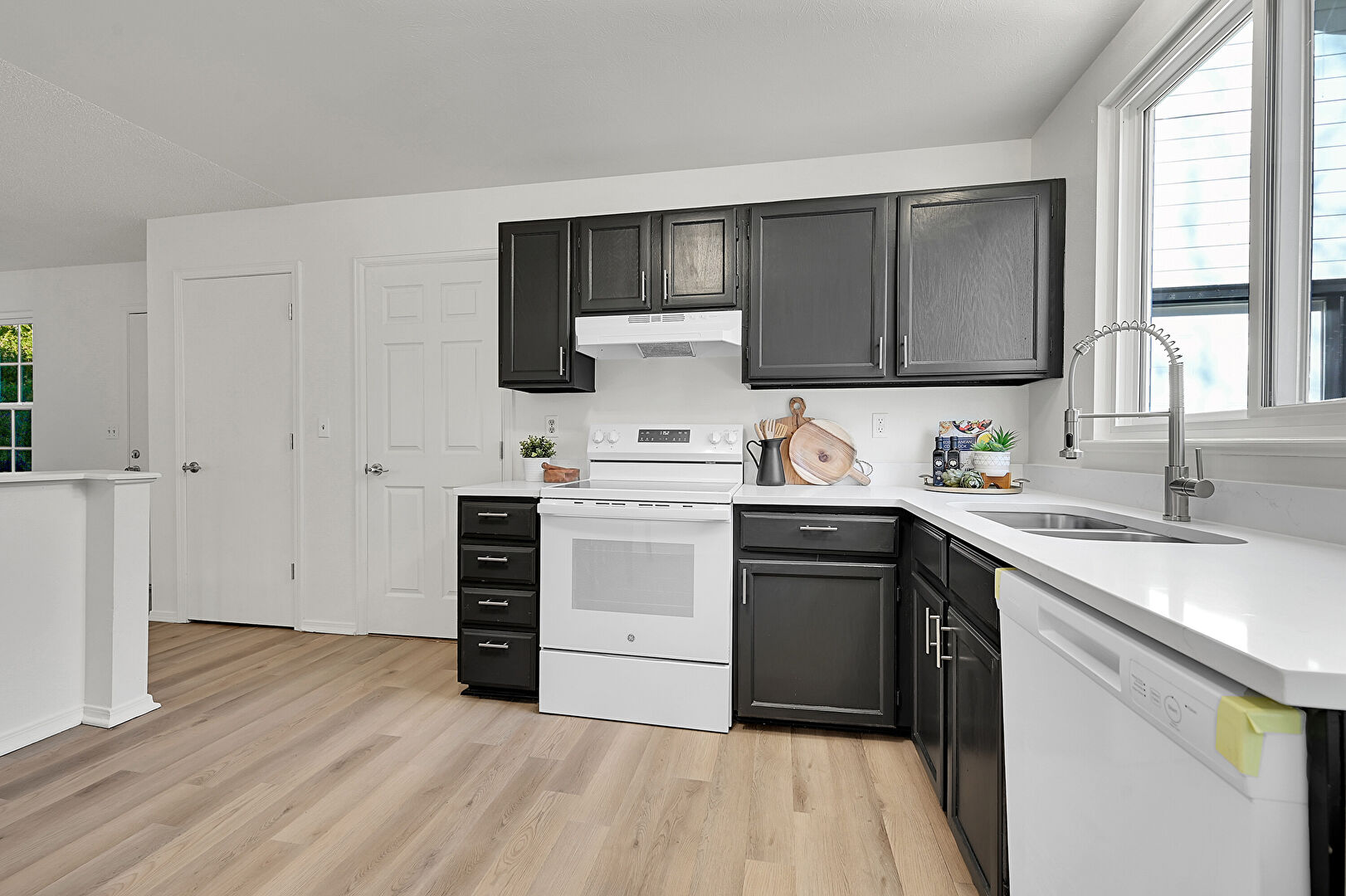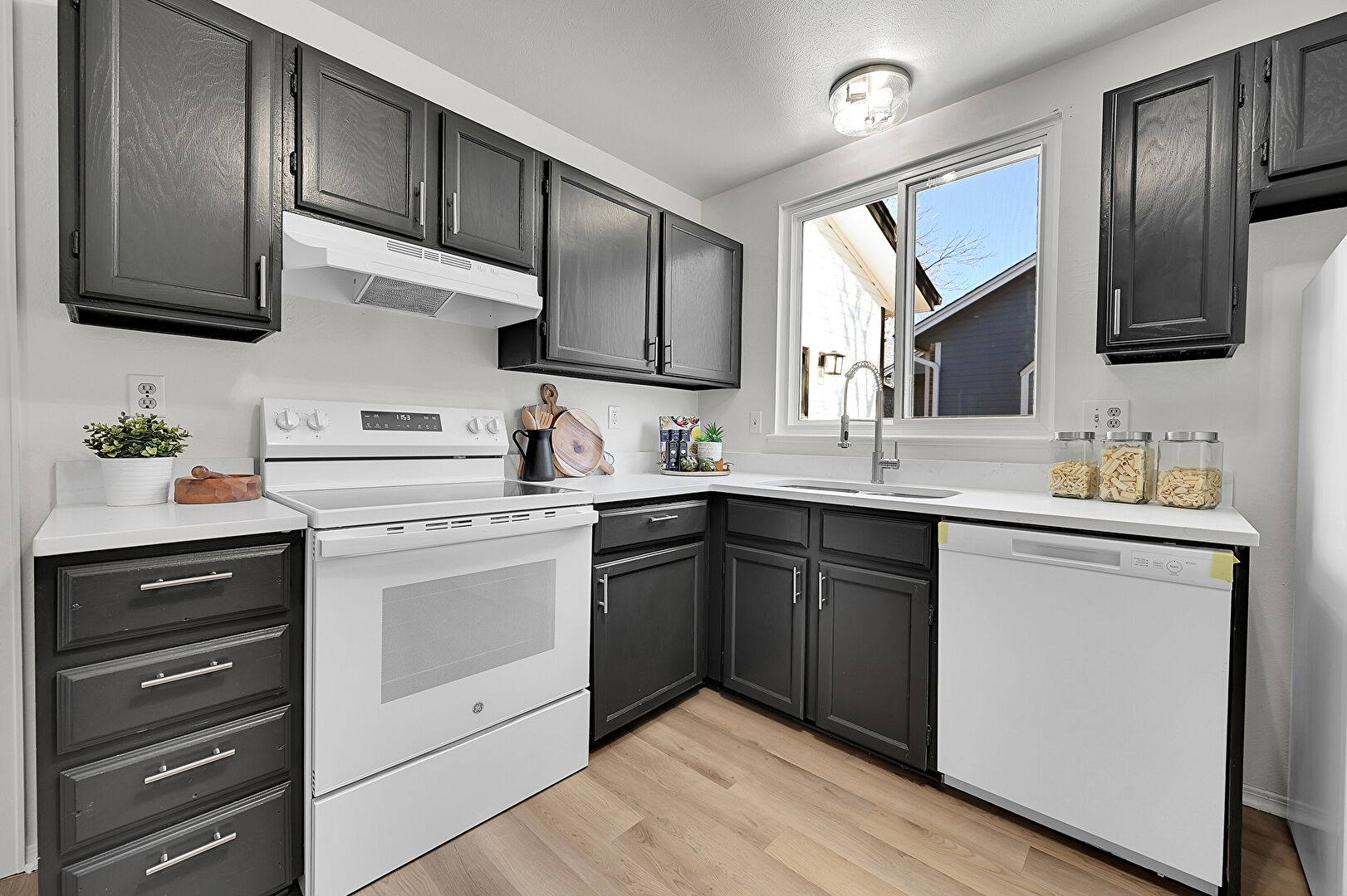 Baseboards Wall, Black Cabinets, Drywall, Gray Cabinets, L Shaped Kitchen, Natural Light, Shaker Cabinets, Skylight, Stone Countertops, Textured Ceiling, Visible Hinge Cabinets, Wood Finish Floor, Black Cabinets, Gray Cabinets, Kitchen Bar, Natural Light, Stone Countertops