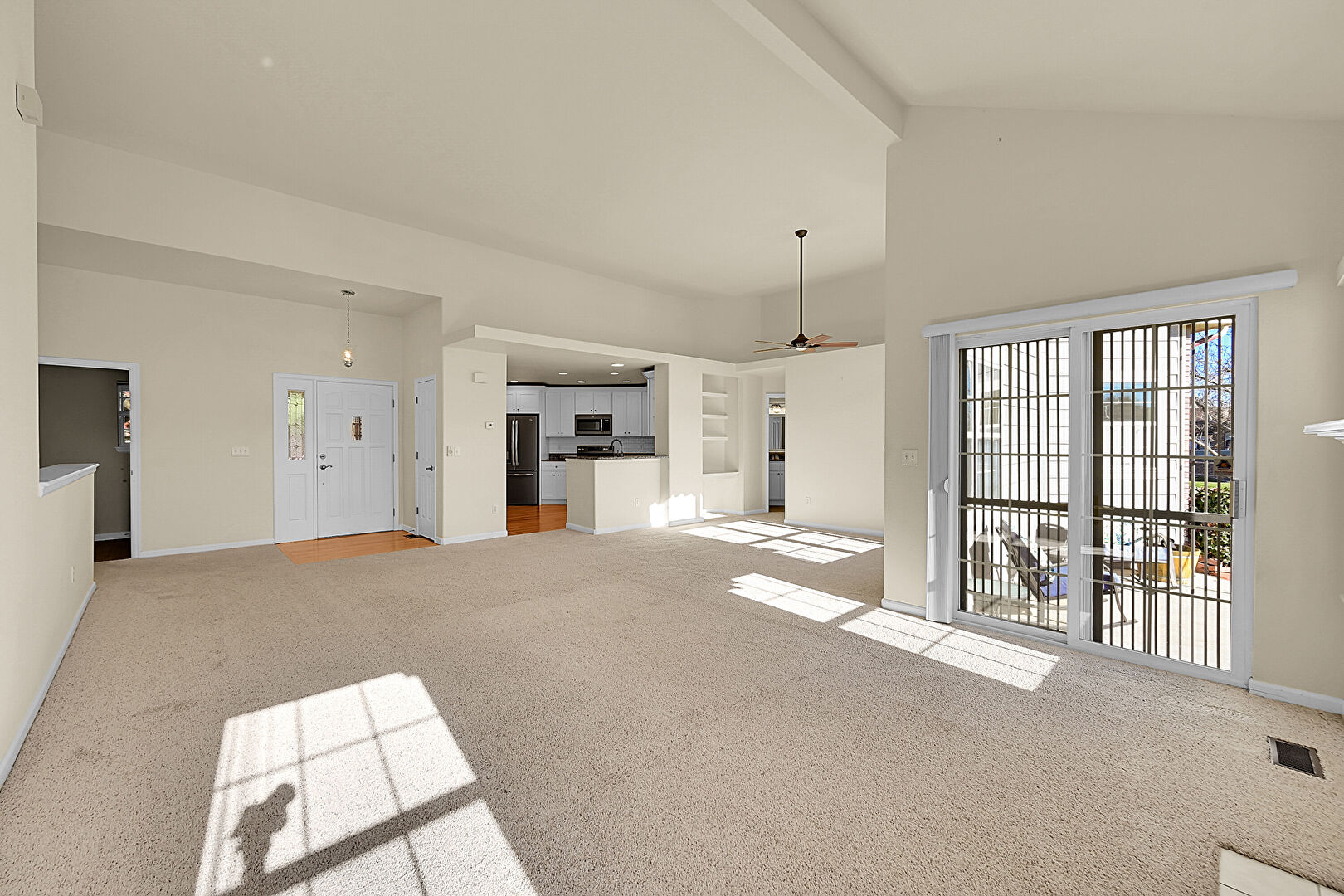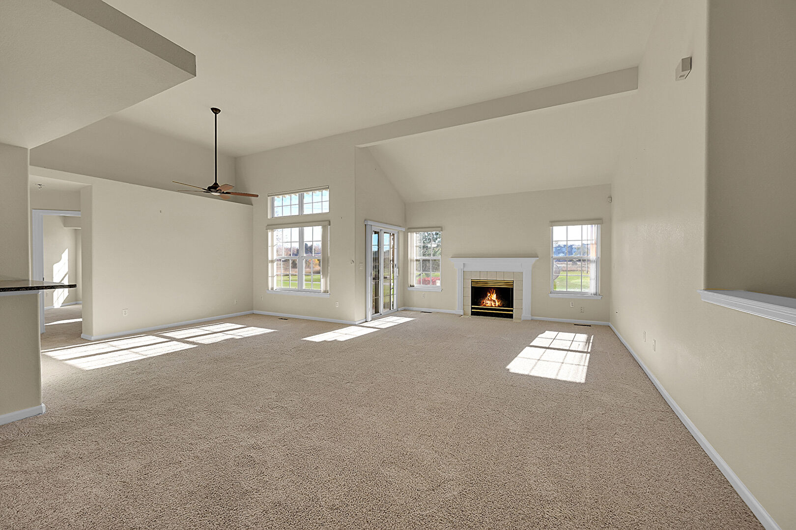 Baseboards Wall, Beamed Ceiling, Carpet, Ceiling Fan, Drywall, Fireplace, High Ceiling, Natural Light, Vaulted Ceiling, Vent, Drywall, High Ceiling