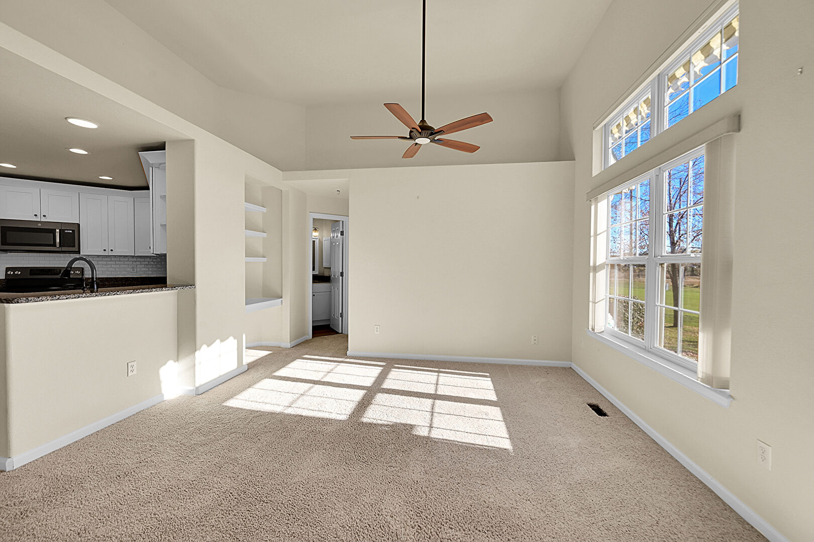 Baseboards Wall, Carpet, Ceiling Fan, Crown Molding Cabinets, Drywall, Kitchen Peninsula, Natural Light, Open Shelves, Opens To Living Area, Recessed Lighting, Shaker Cabinets, Stone Countertops, U Shaped Kitchen, Vent, Wood Finish Floor, Baseboards Wall, Natural Light, Recessed Lighting