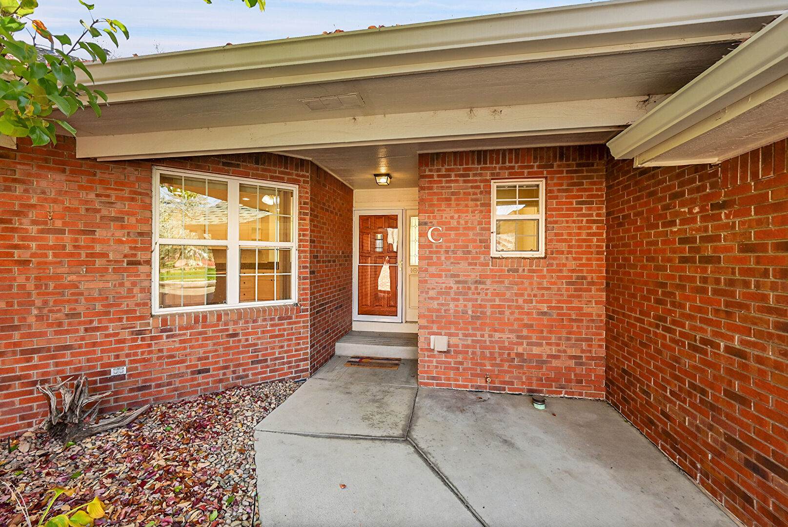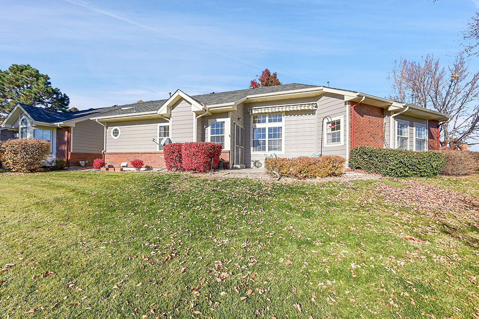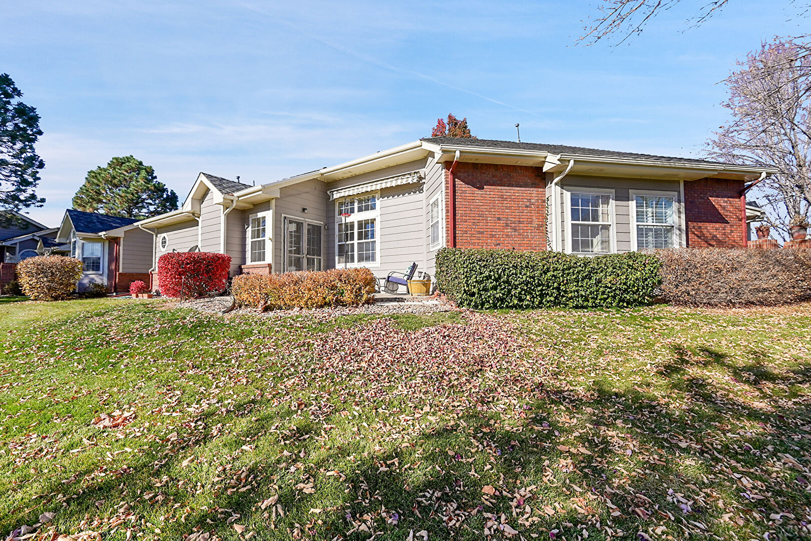 Awning, Brick Siding, Downspout, Driveway, Gutters, Horizontal Siding, Lawn, Patio, Satellite Dish, Brick Siding, Shingle Roof