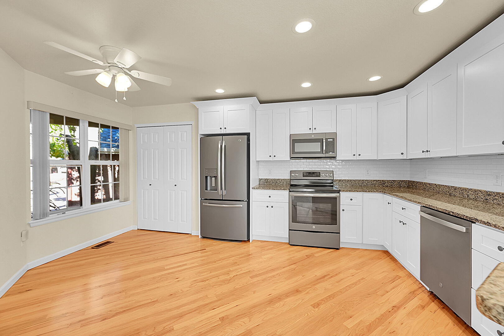 Baseboards Wall, Ceiling Fan, Crown Molding Cabinets, Downspout, Drywall, Gutters, Horizontal Siding, Lawn, Natural Light, Opens To Living Area, Recessed Lighting, Shaker Cabinets, Stone Countertops, Wood Finish Floor, Brick Siding, Vent