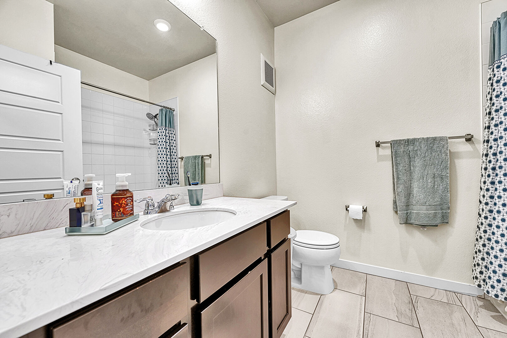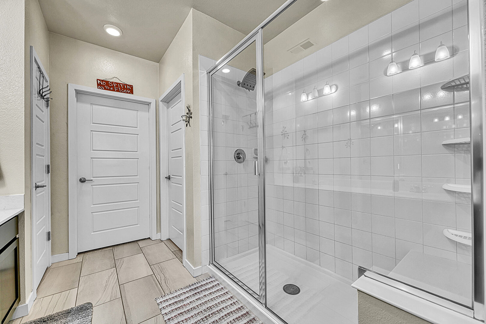 Baseboards Wall, Combined Bath Shower, Full Bathroom, Recessed Lighting, Tile Floor, Vanity, Vent, Drywall, Textured Wall