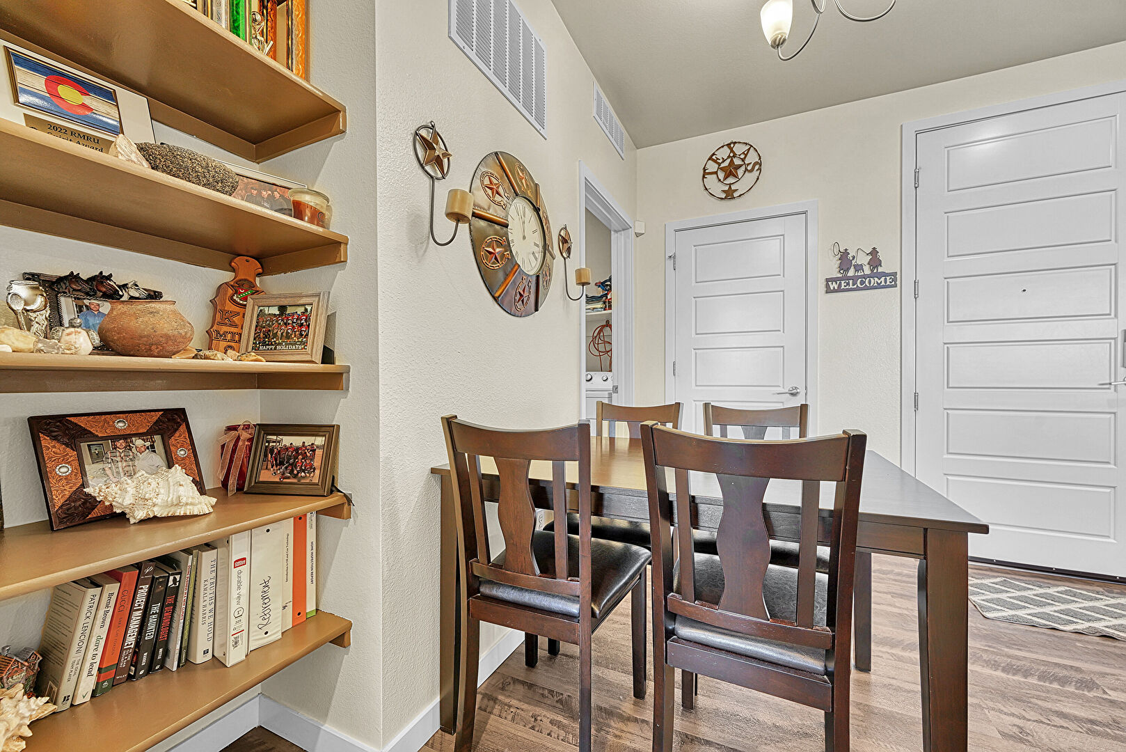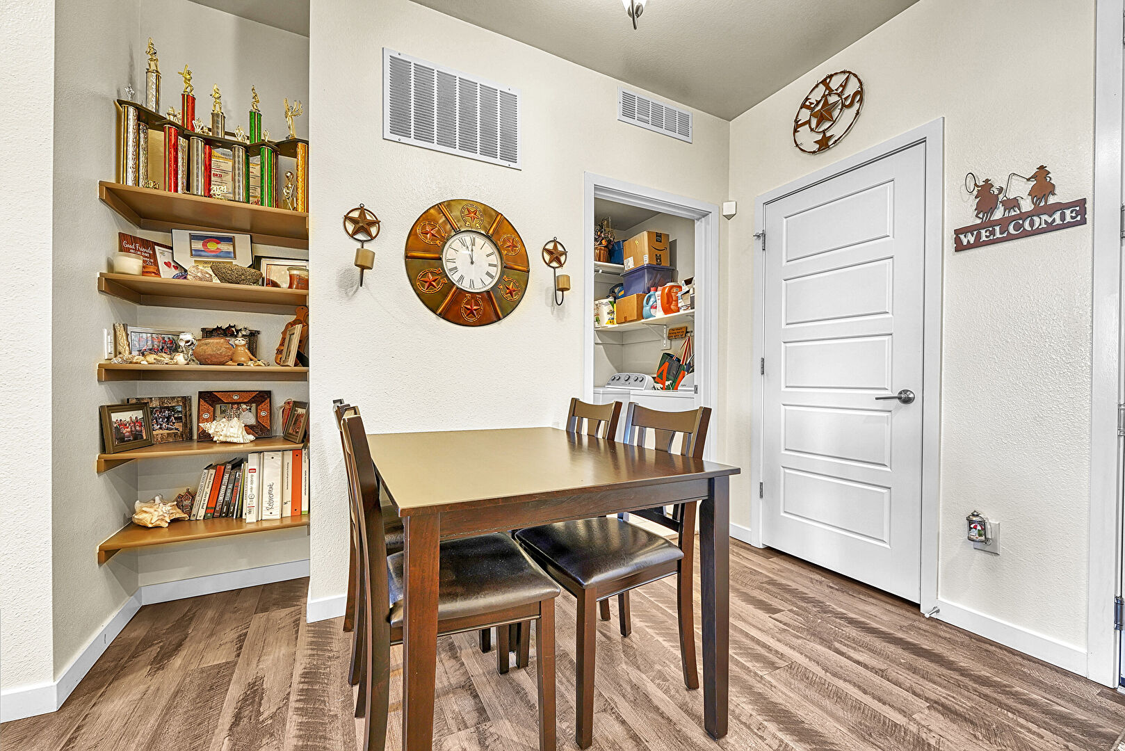 Baseboards Wall, Laundry, Notable Chandelier, Textured Wall, Vent, Wood Finish Floor