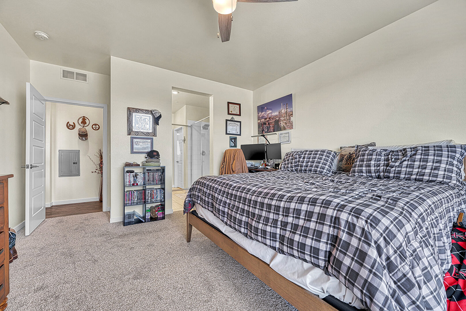 Baseboards Wall, Carpet, Ceiling Fan, Closet, Drywall, Electric Panel, Natural Light, Office Area, Vent, Baseboards Wall, Smoke Carbon Monoxide Detector, Vent