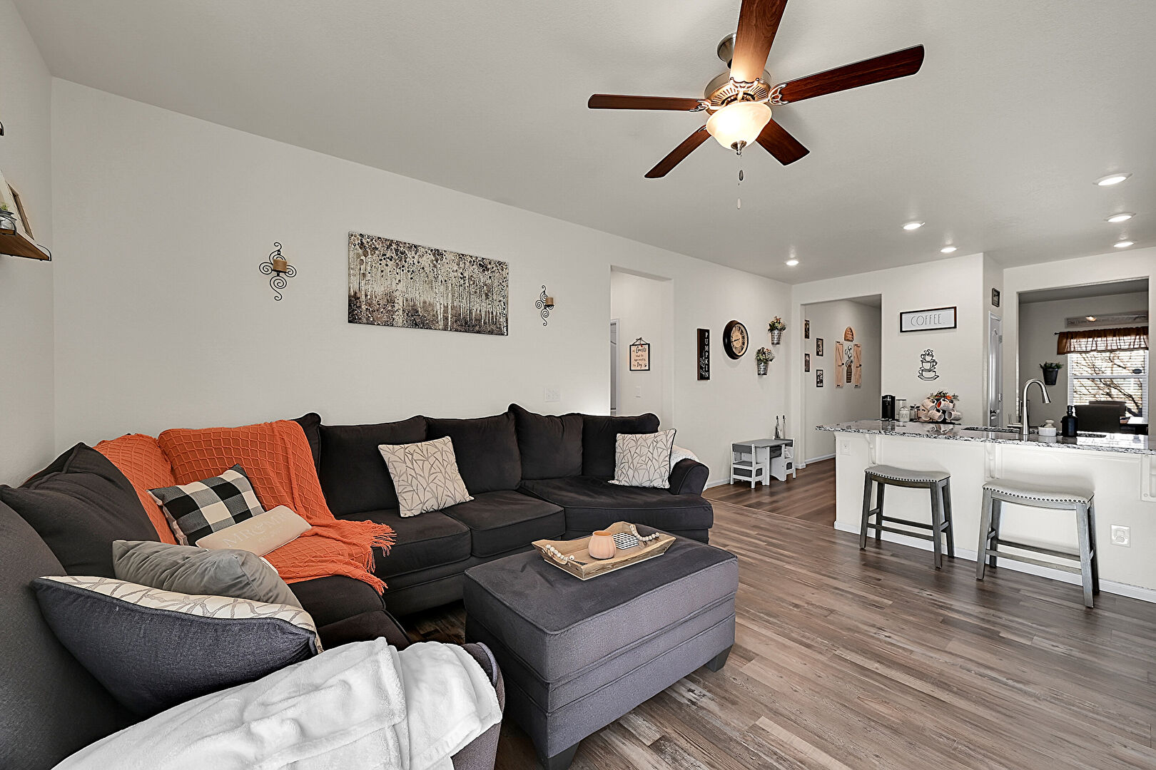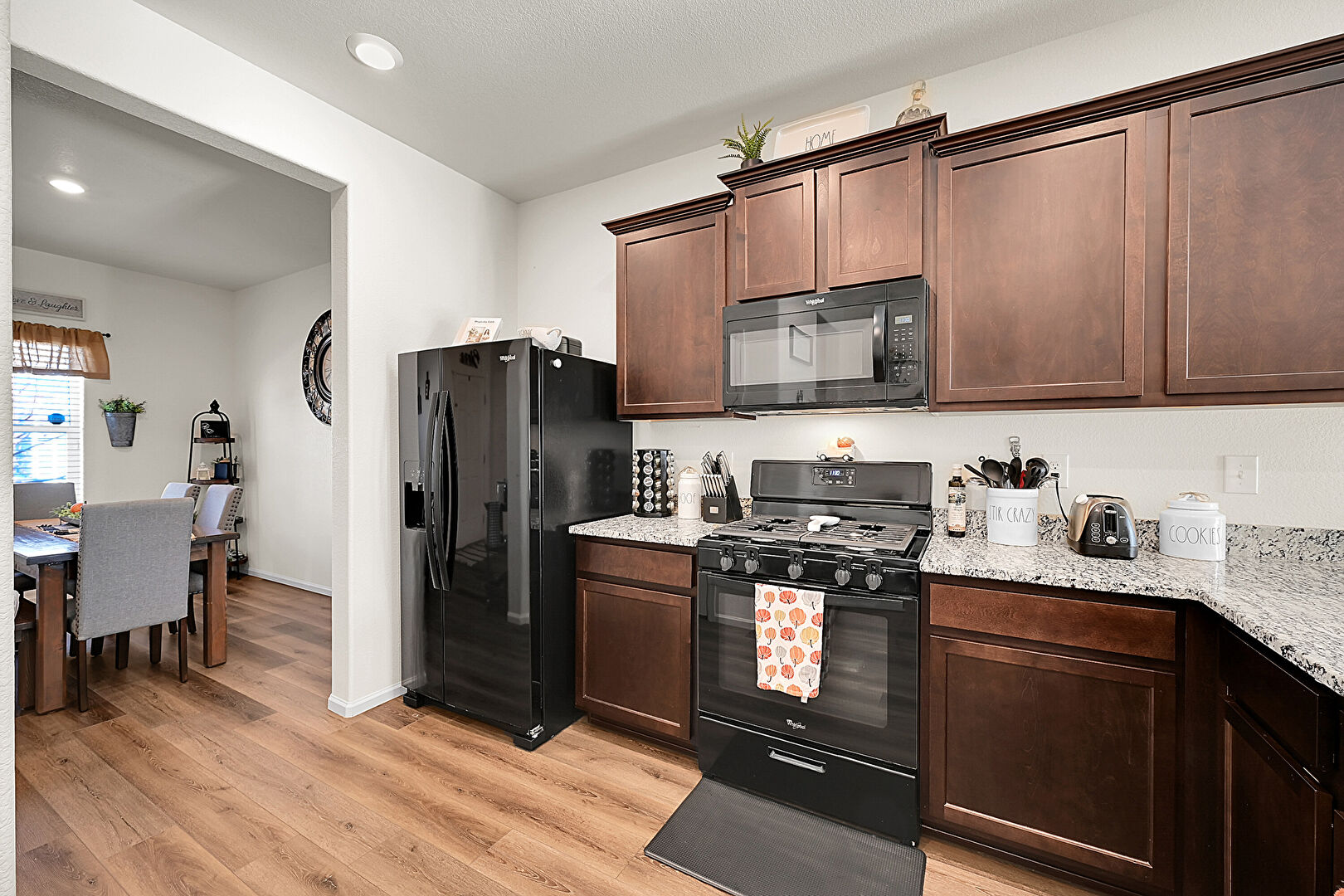 Baseboards Wall, Ceiling Fan, Crown Molding Cabinets, Dark Brown Cabinets, Drywall, Kitchen Bar, Kitchen Peninsula, L Shaped Kitchen, Natural Light, Opens To Living Area, Recessed Lighting, Shaker Cabinets, Stone Countertops, Textured Ceiling, Wood Finish Floor, Crown Molding Cabinets, Natural Light, Wood Finish Floor