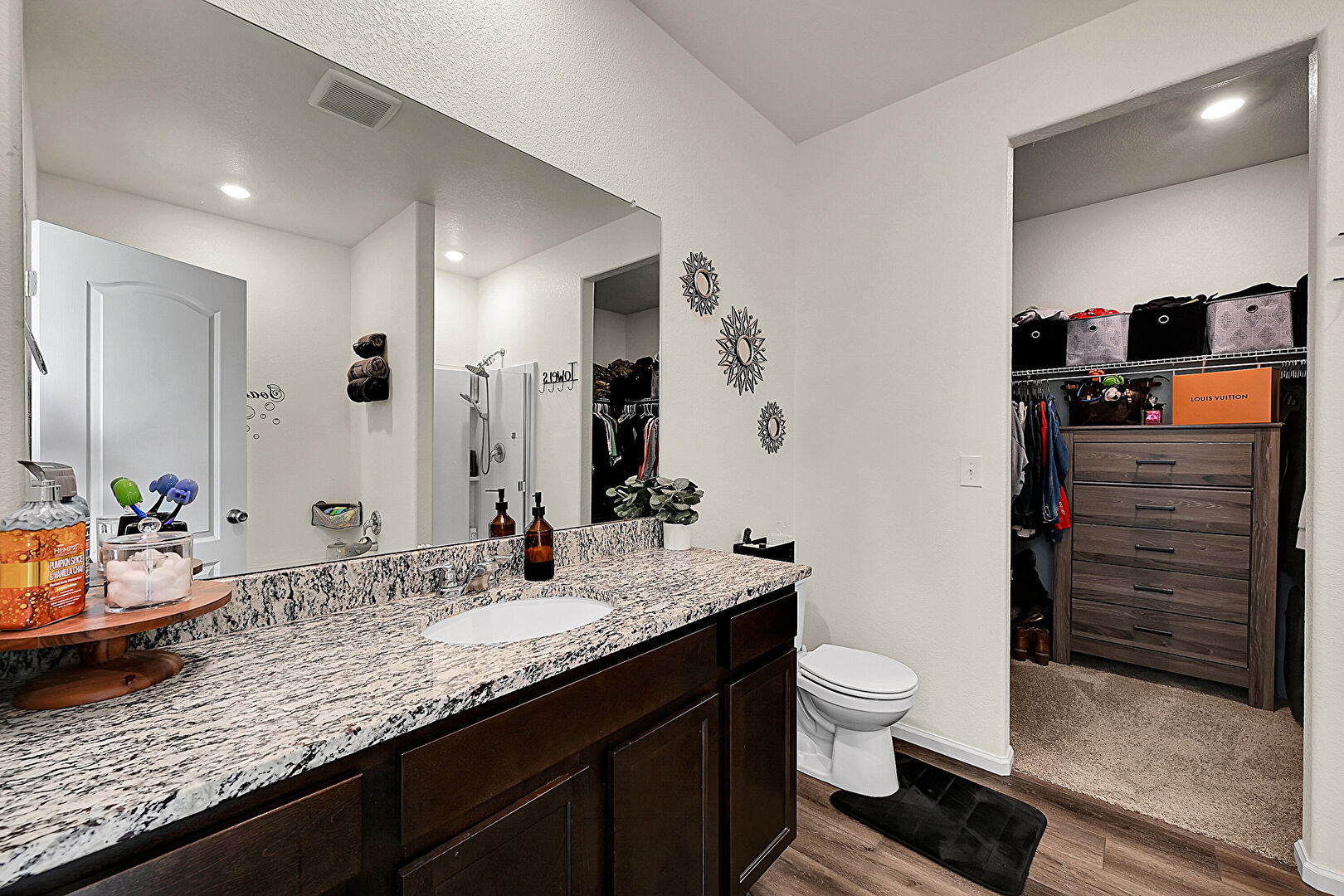 Baseboards Wall, Drywall, Ensuite Bathroom, Full Bathroom, Recessed Lighting, Textured Wall, Vent, Walk In Closet, Wood Finish Floor, Recessed Lighting, Vanity