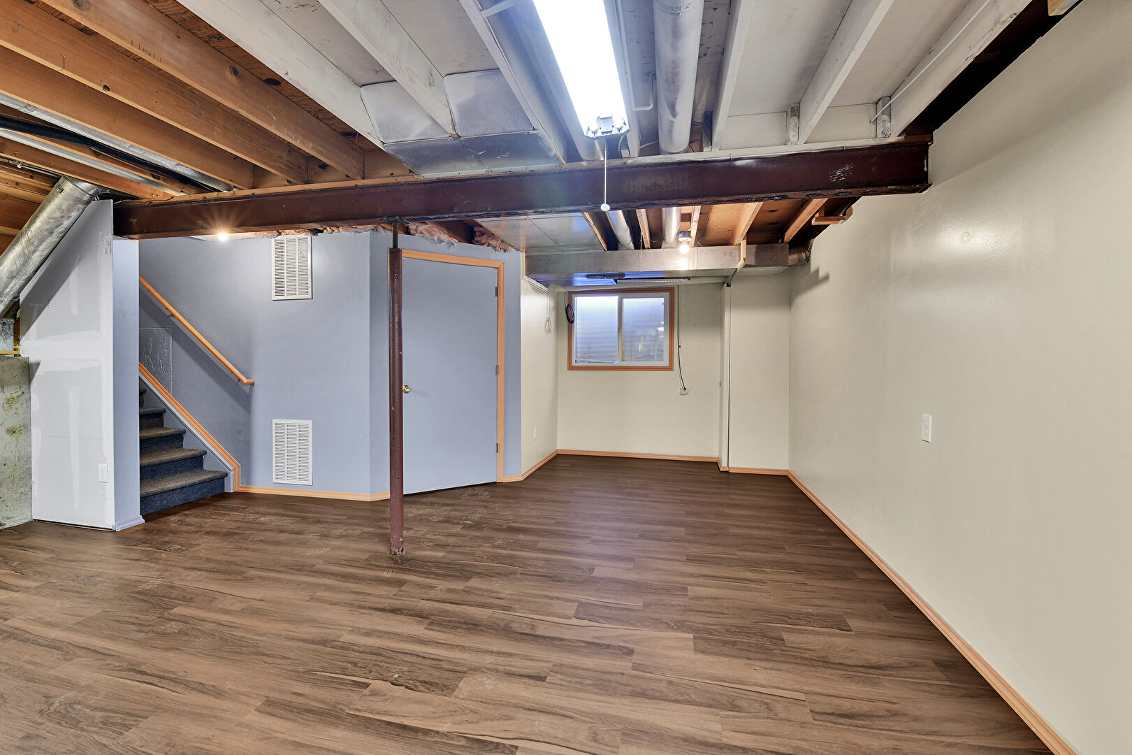 Baseboards Wall, Basement, Drywall, Natural Light, Stairs, Vent, Wood Finish Floor, Basement, Natural Light, Wood Finish Floor