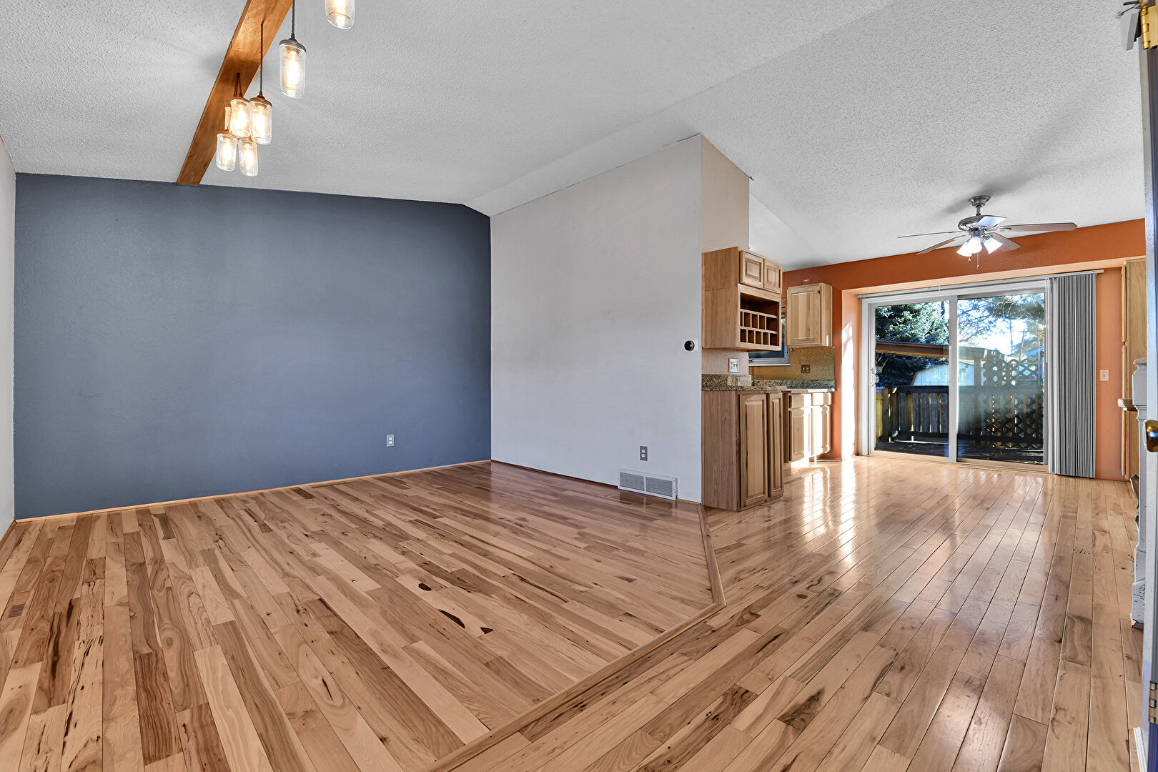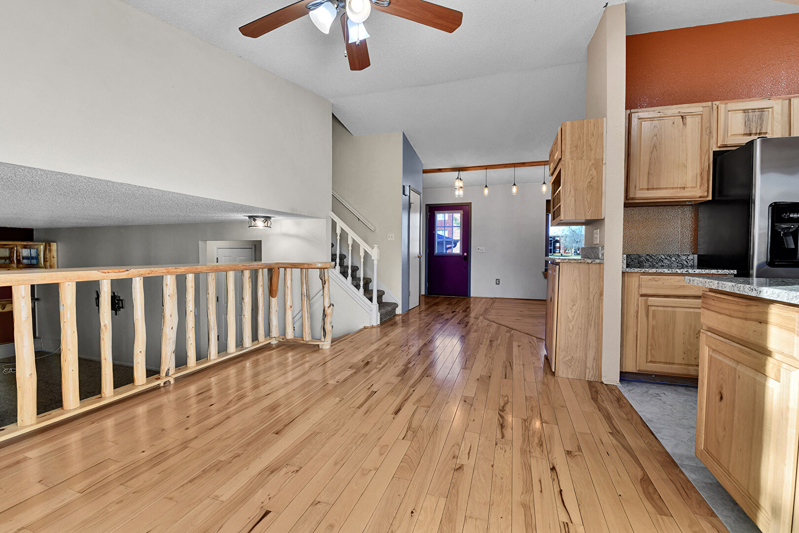 Baseboards Wall, Beamed Ceiling, Ceiling Fan, Drywall, Natural Light, Textured Ceiling, Track Lighting, Vaulted Ceiling, Vent, Wood Finish Floor, Baseboards Wall, Stairs, Wood Finish Floor