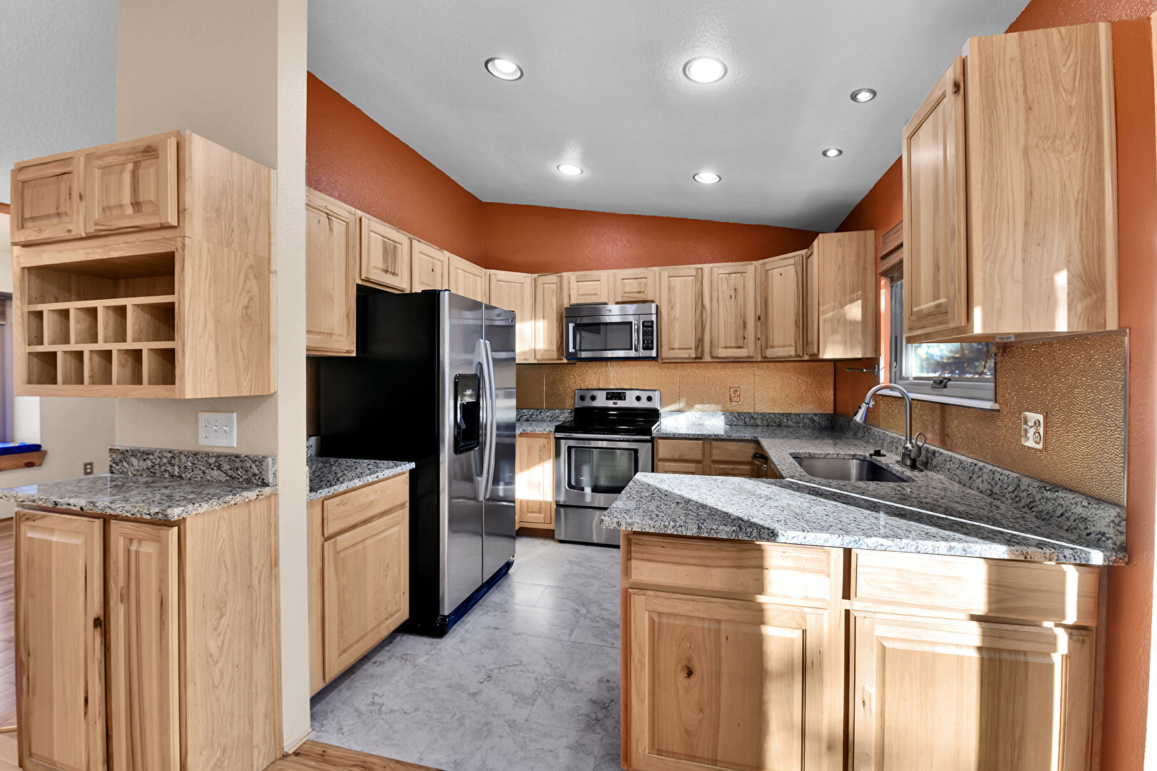 Ceiling Fan, Drywall, G Shaped Kitchen, Kitchen Peninsula, Natural Light, Open Shelves, Raised Cabinets, Stone Countertops, Textured Ceiling, Textured Wall, Vaulted Ceiling, Wood Finish Floor, Recessed Lighting, Stone Countertops, Textured Wall