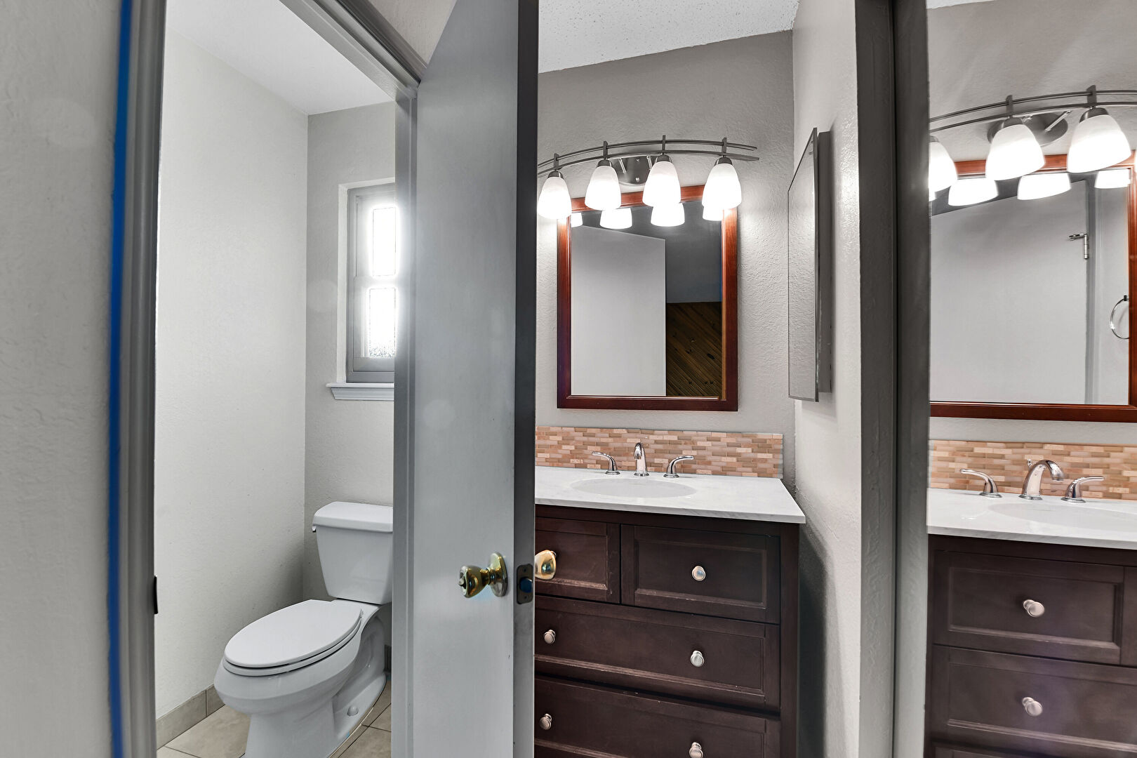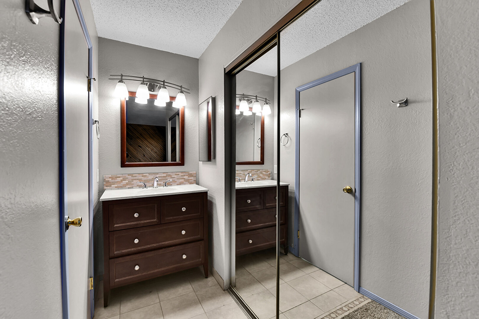 Baseboards Wall, Drywall, Full Bathroom, Natural Light, Textured Ceiling, Textured Wall, Tile Floor, Two Single Vanities, Carpet, Full Bathroom, Water Closet