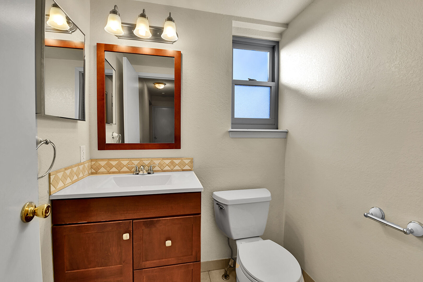 Baseboards Wall, Combined Bath Shower, Full Bathroom, Half Bathroom, Natural Light, Textured Ceiling, Textured Wall, Tile Floor, Vanity, Combined Bath Shower, Tile Floor, Vanity