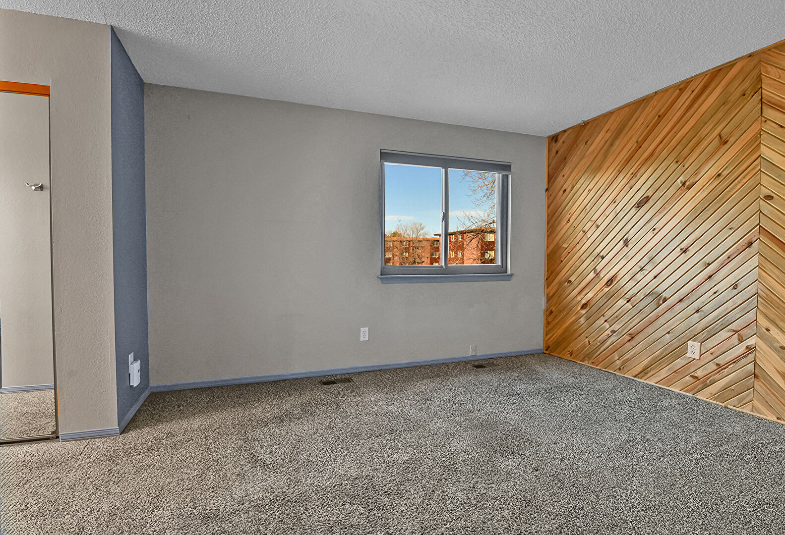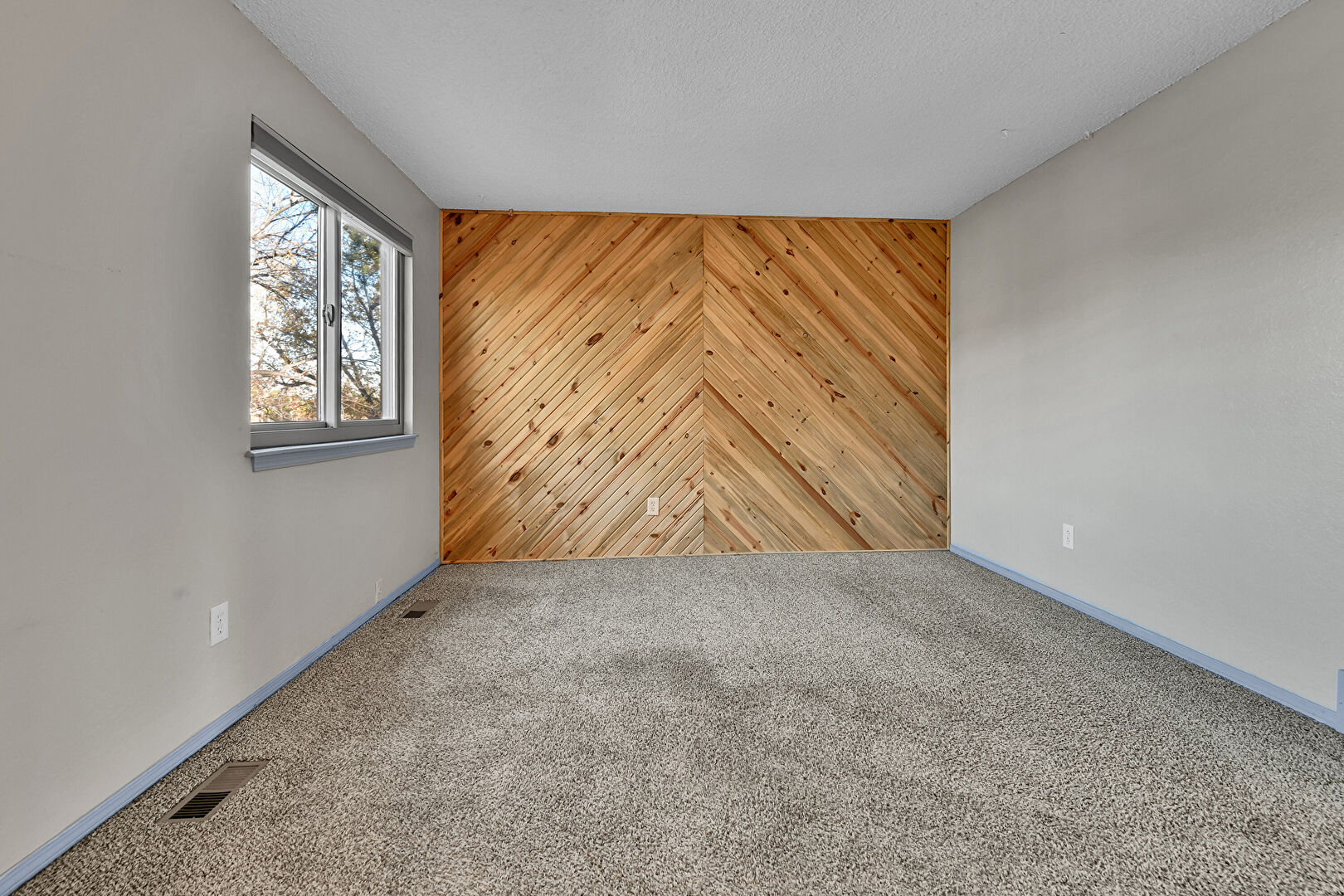 Accent Wall, Baseboards Wall, Carpet, Drywall, Ensuite Bathroom, Natural Light, Smoke Carbon Monoxide Detector, Textured Ceiling, Vent, Wood Wall, Carpet, Closet, Textured Ceiling