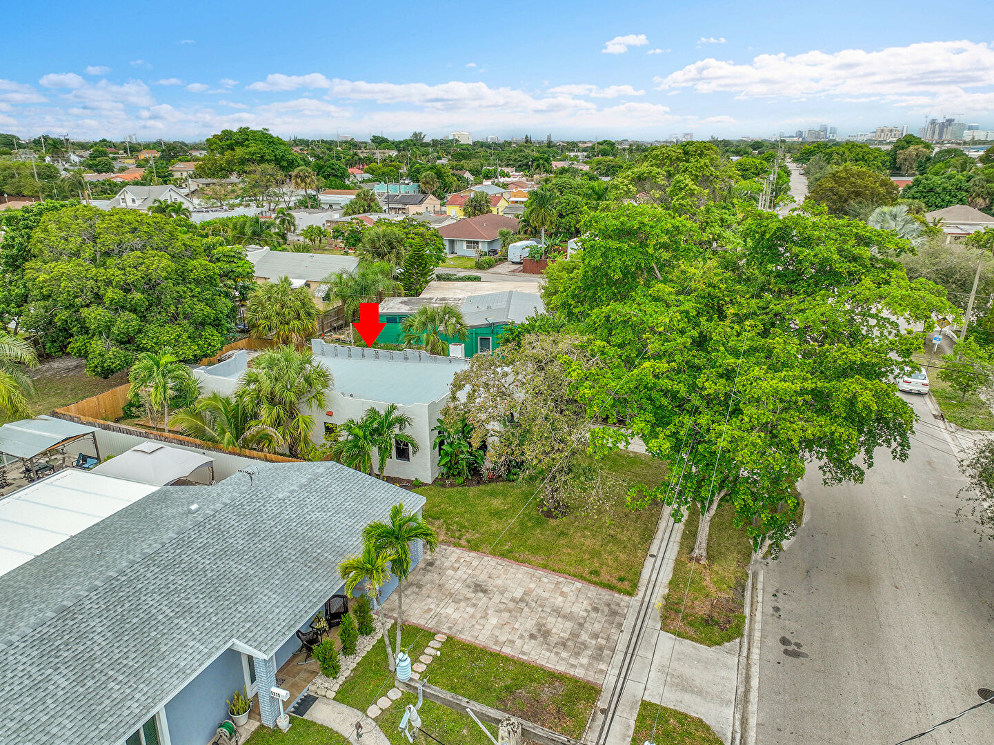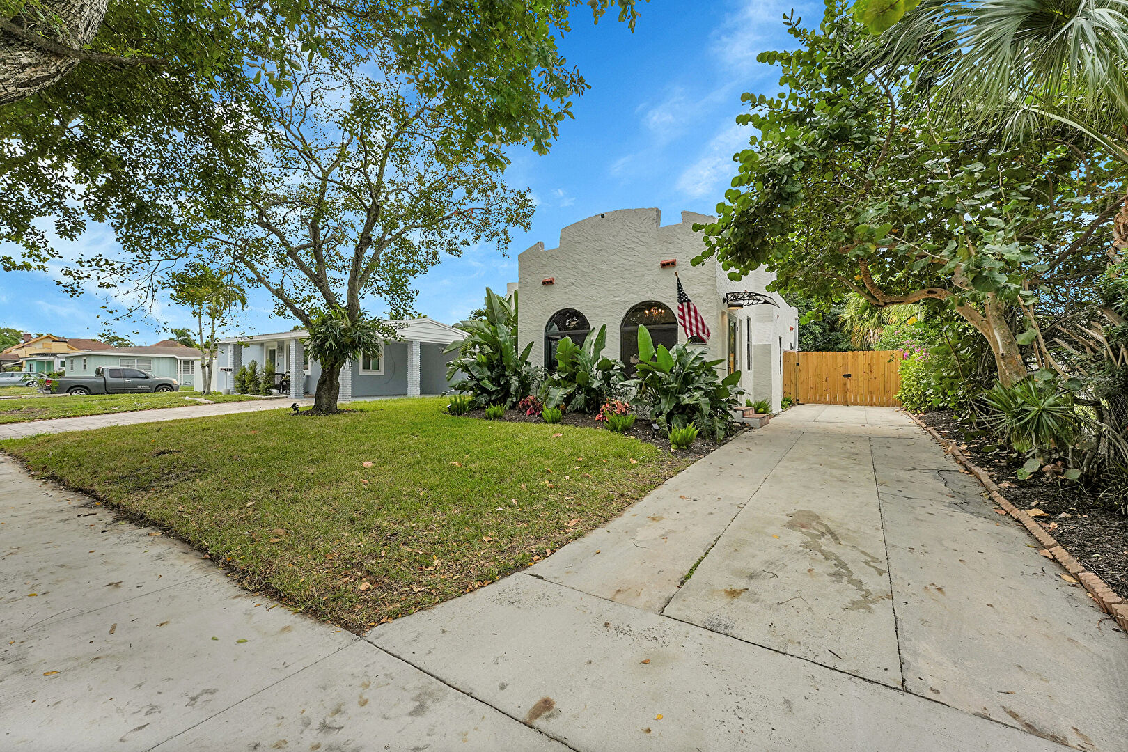 Driveway, Fence, Gate, Lawn, Parking Pad, Stucco Siding, Driveway, Lawn, Parking Pad, Stucco Siding