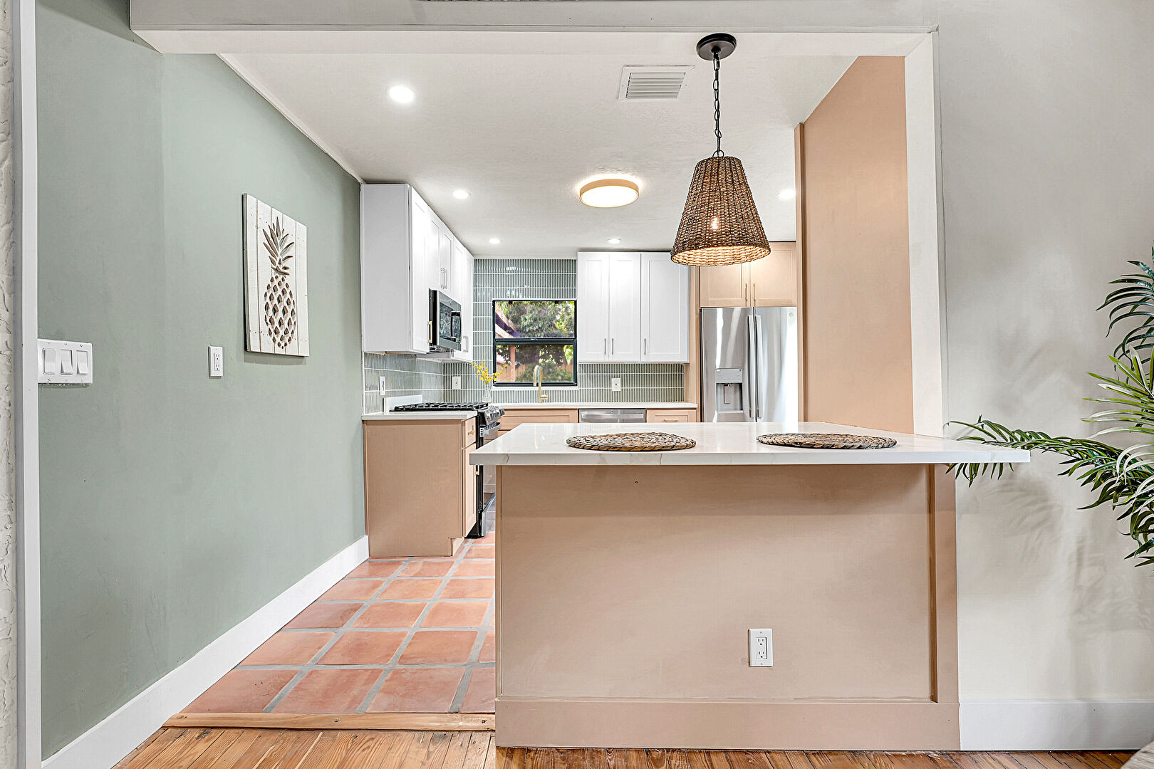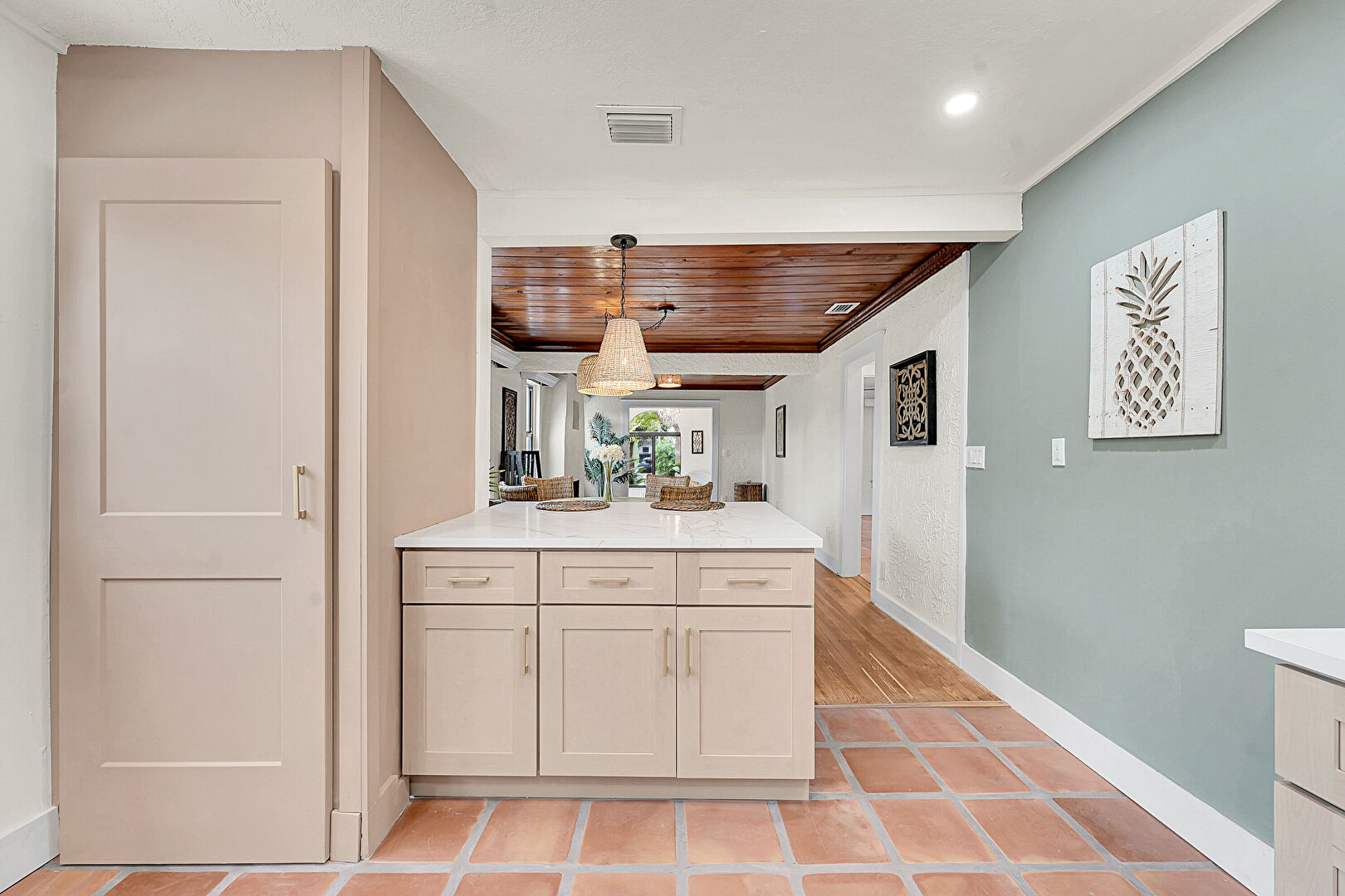 Baseboards Wall, Crown Molding, Drywall, Kitchen Peninsula, L Shaped Kitchen, Natural Light, Pendant Lighting, Recessed Lighting, Shaker Cabinets, Smoke Carbon Monoxide Detector, Stone Countertops, Textured Ceiling, Tile Floor, Vent, Wood Ceiling, Drywall, Natural Light, Opens To Living Area, Recessed Lighting