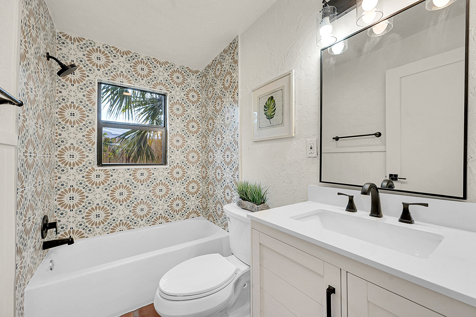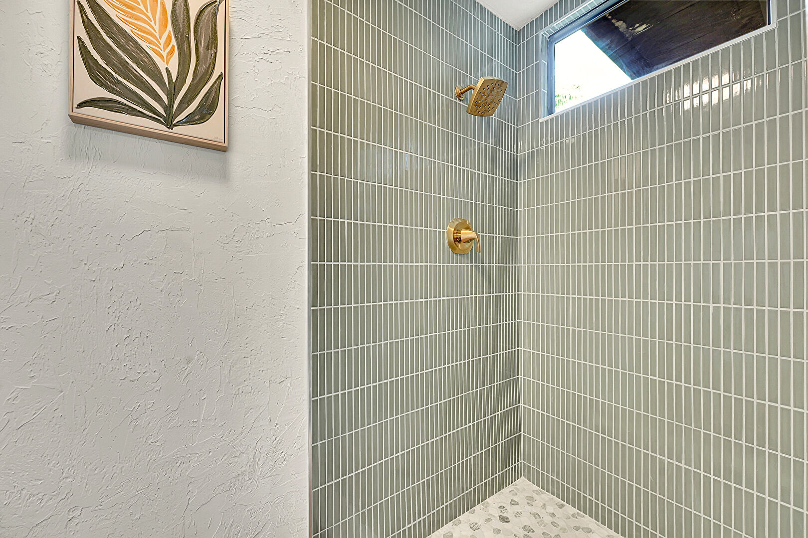 Combined Bath Shower, Full Bathroom, Natural Light, Vanity, Textured Wall