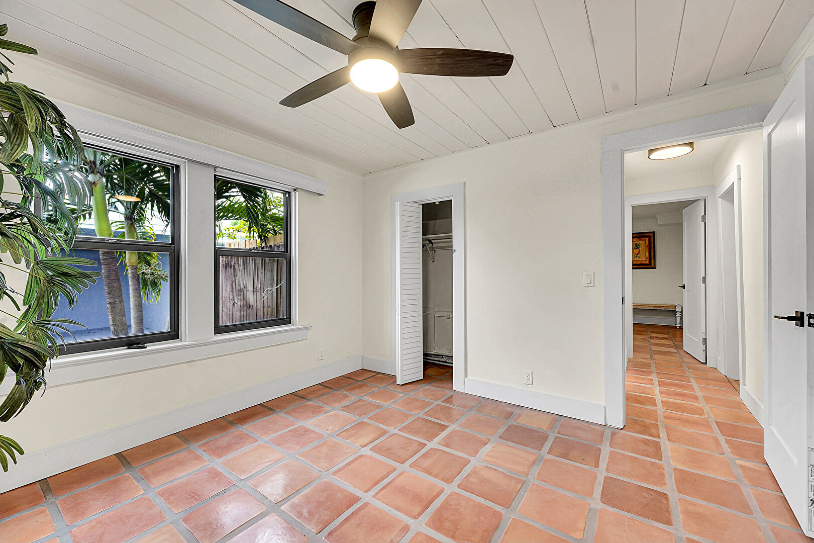 Baseboards Wall, Ceiling Fan, Closet, Crown Molding, Drywall, Natural Light, Tile Floor, Wood Ceiling, Baseboards Wall, Ceiling Fan