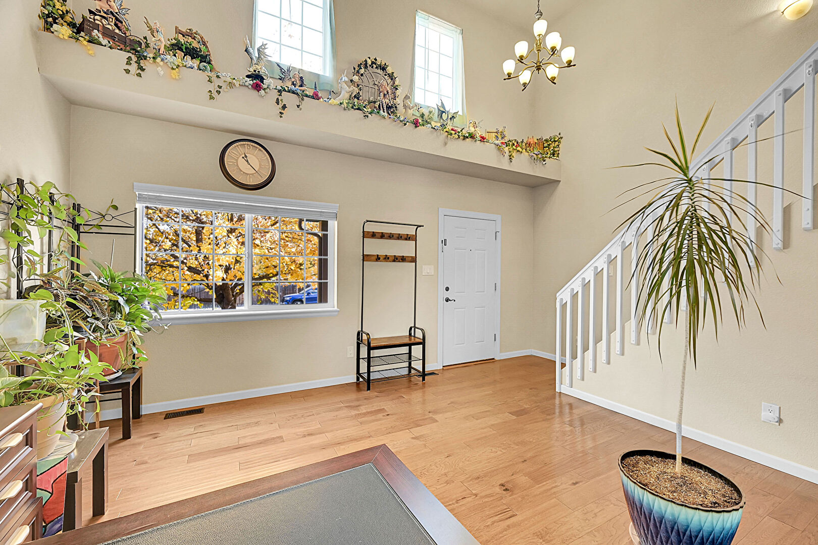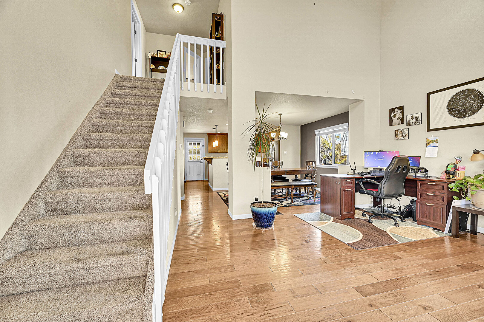 Baseboards Wall, Drywall, High Ceiling, Natural Light, Notable Chandelier, Office Area, Stairs, Wood Finish Floor, Natural Light, Vent