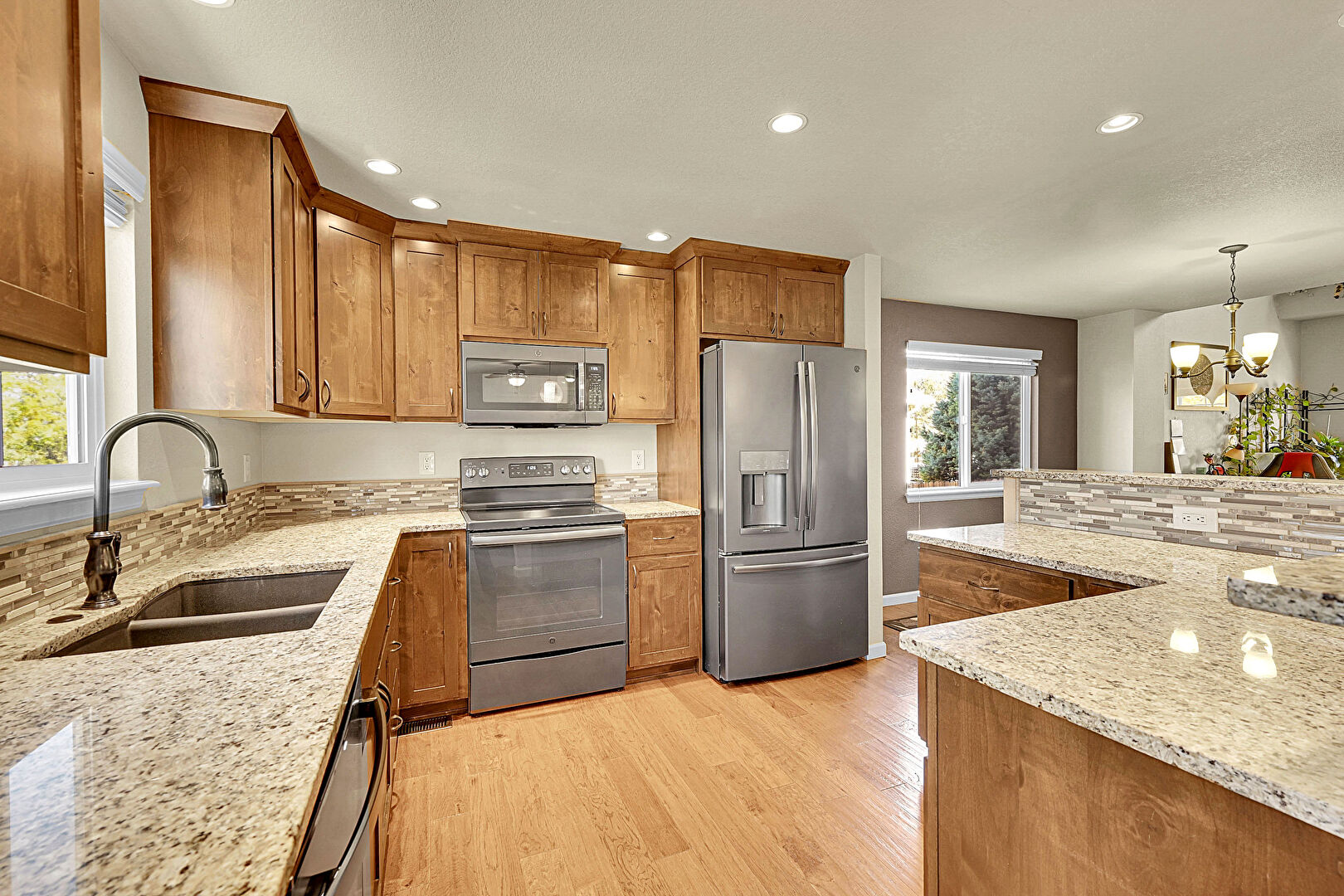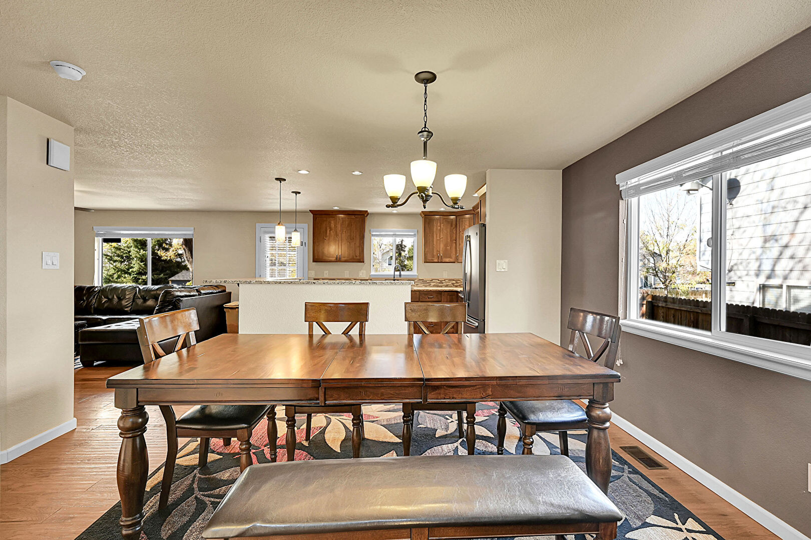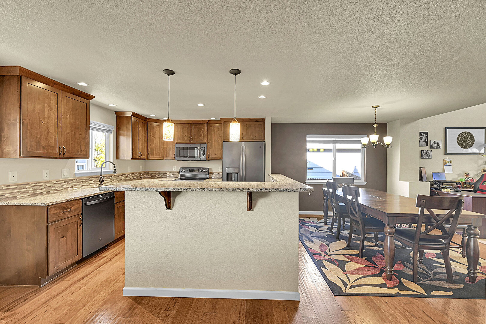 Baseboards Wall, Ceiling Fan, Crown Molding Cabinets, Drywall, Kitchen Bar, Kitchen Island, L Shaped Kitchen, Medium Brown Cabinets, Natural Light, Notable Chandelier, Opens To Living Area, Pendant Lighting, Recessed Lighting, Shaker Cabinets, Stone Countertops, Textured Ceiling, Wood Finish Floor, Baseboards Wall, Crown Molding Cabinets, Drywall
