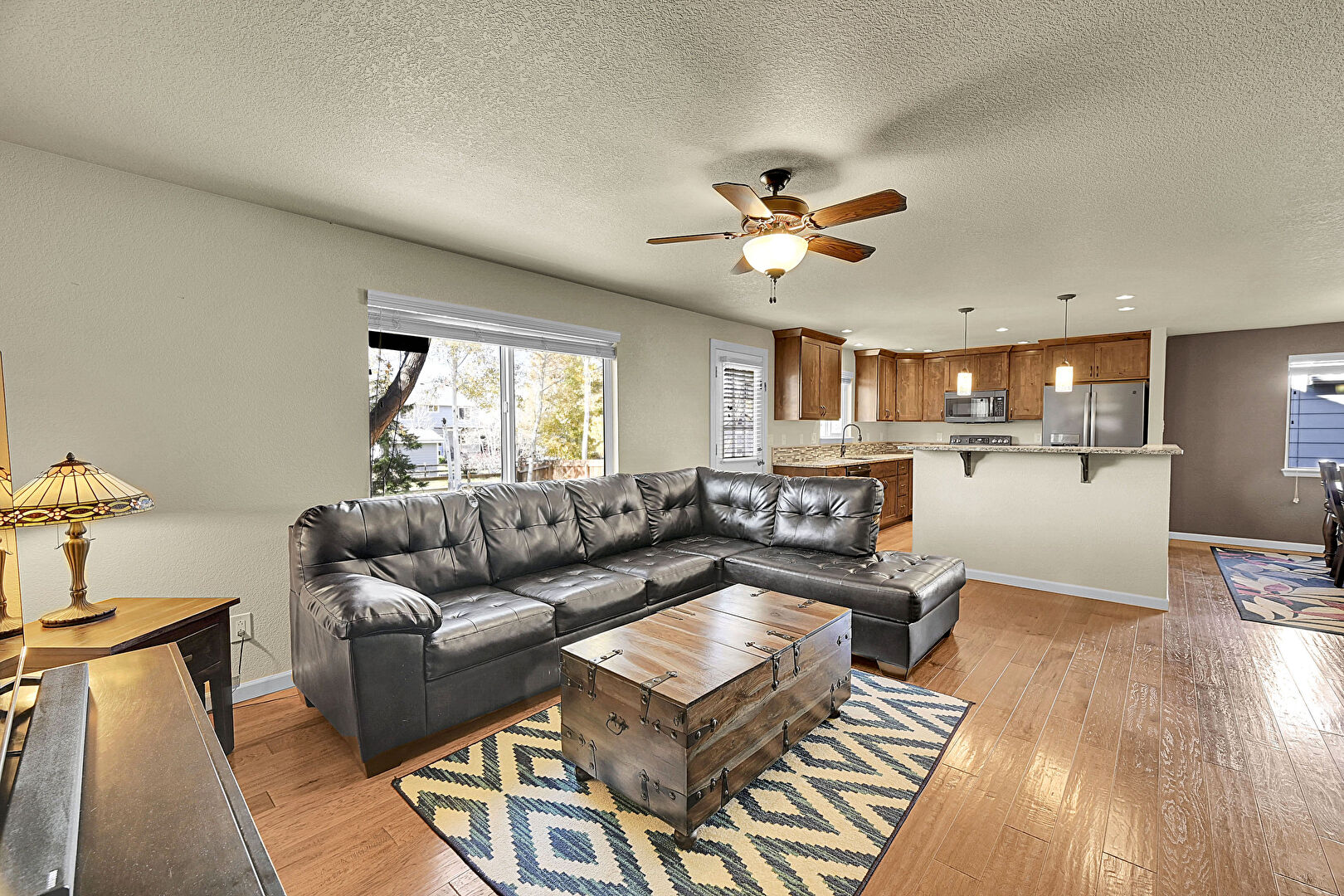 Baseboards Wall, Ceiling Fan, Drywall, L Shaped Kitchen, Natural Light, Textured Ceiling, Wood Finish Floor, Drywall, Natural Light
