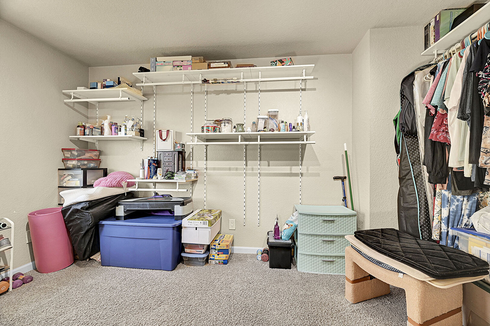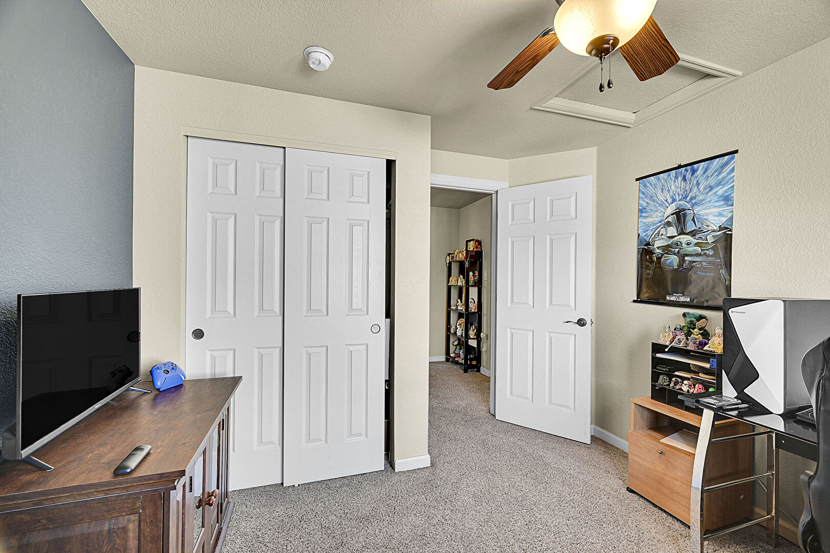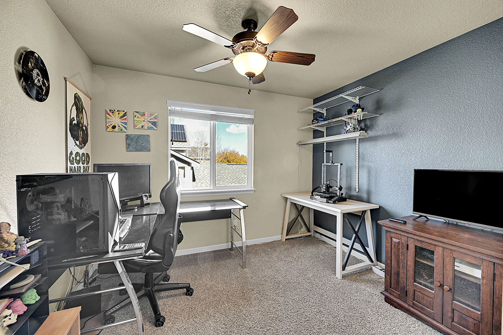Aggregate Floor, Baseboards Wall, Carpet, Ceiling Fan, Natural Light, Office Area, Scuttle, Smoke Carbon Monoxide Detector, Textured Ceiling, Textured Wall, Ceiling Fan, Office Area