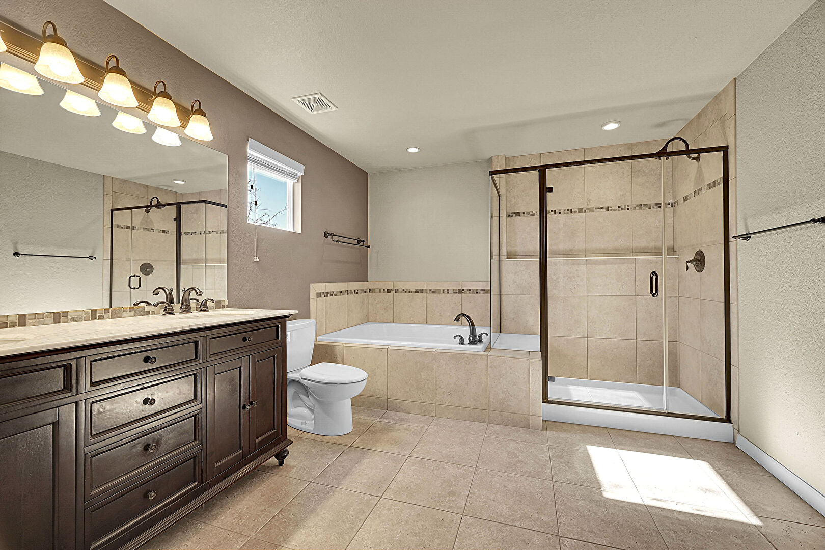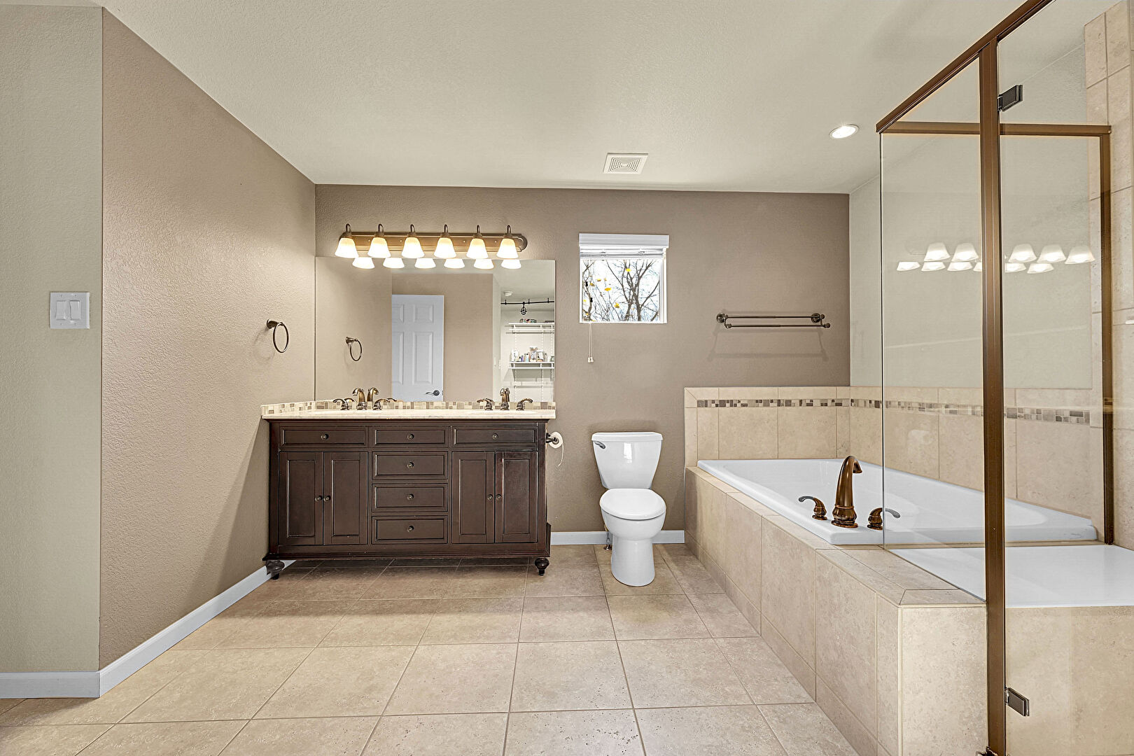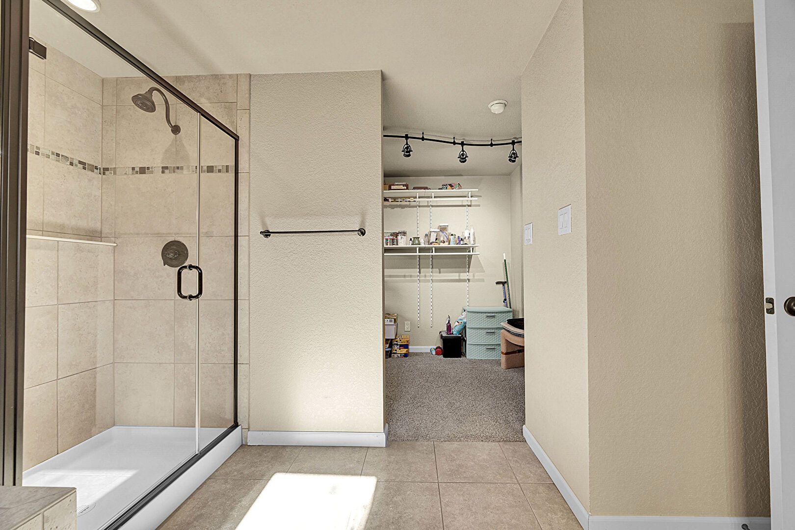 Baseboards Wall, Carpet, Double Vanity, Drywall, Full Bathroom, Natural Light, Recessed Lighting, Tile Floor, Track Lighting, Vent, Walk In Closet, Full Bathroom, Recessed Lighting, Textured Wall