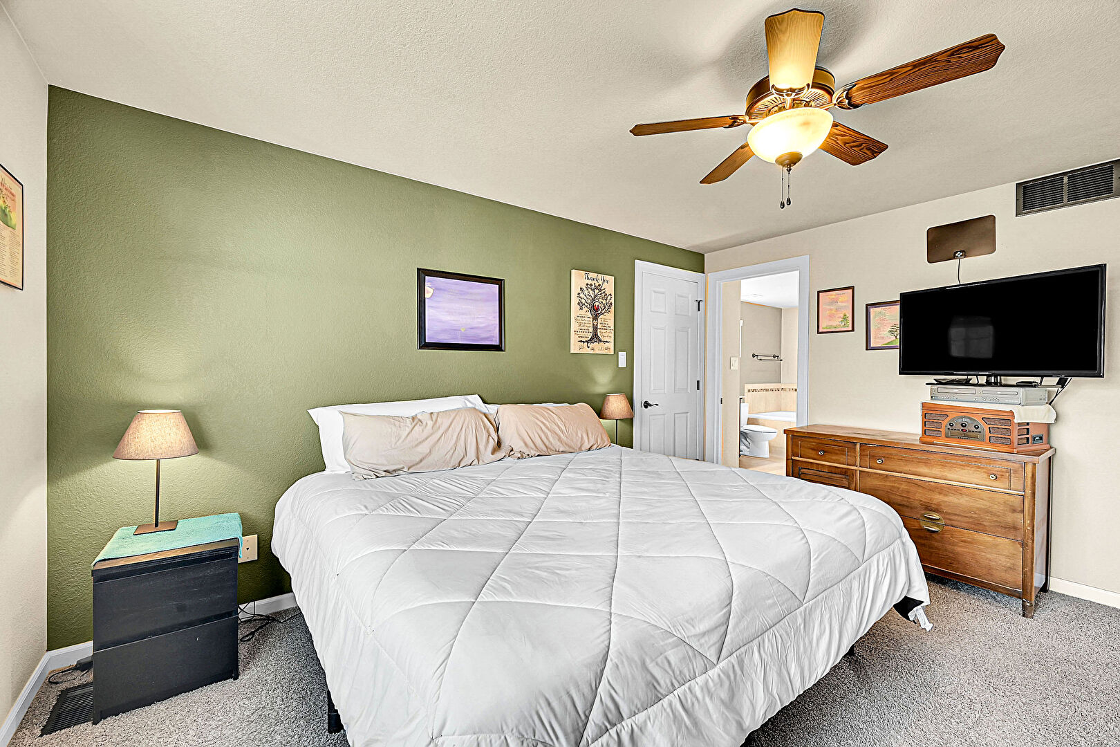 Baseboards Wall, Carpet, Drywall, Ensuite Bathroom, Natural Light, Textured Ceiling, Vent, Ceiling Fan