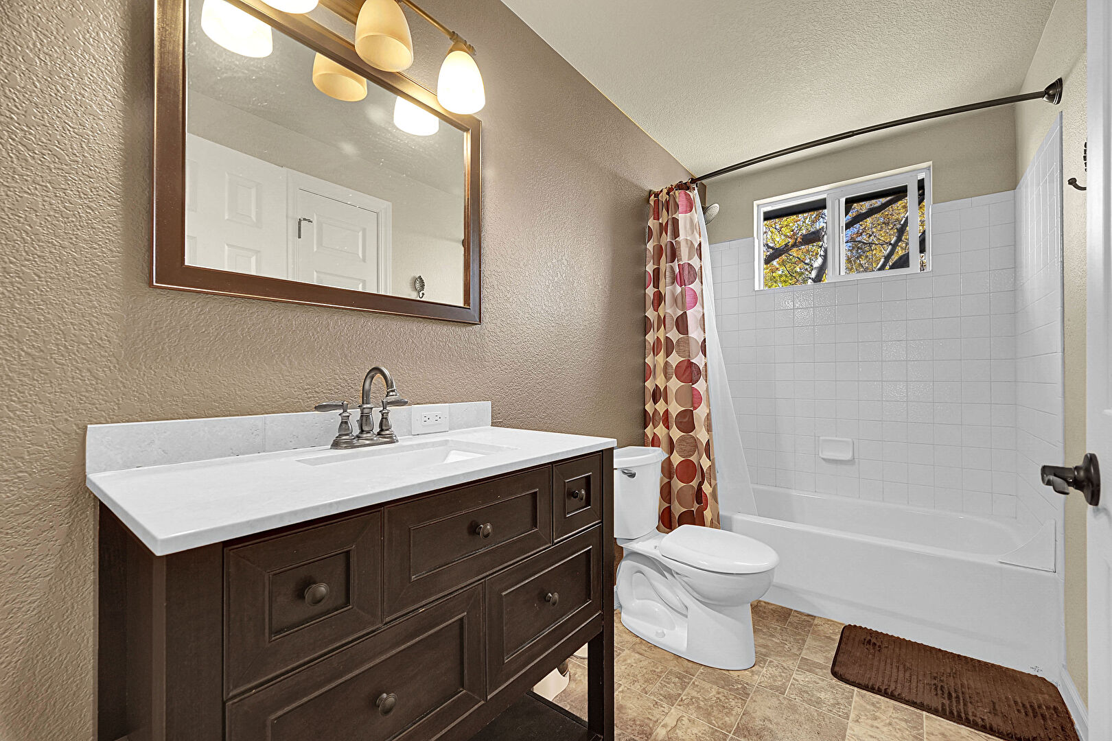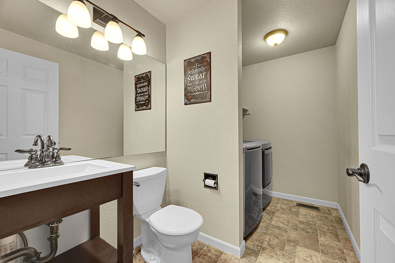Baseboards Wall, Full Bathroom, Half Bathroom, Laundry, Natural Light, Stone Finish Floor, Textured Ceiling, Textured Wall, Vanity, Vent, Combined Bath Shower, Textured Ceiling