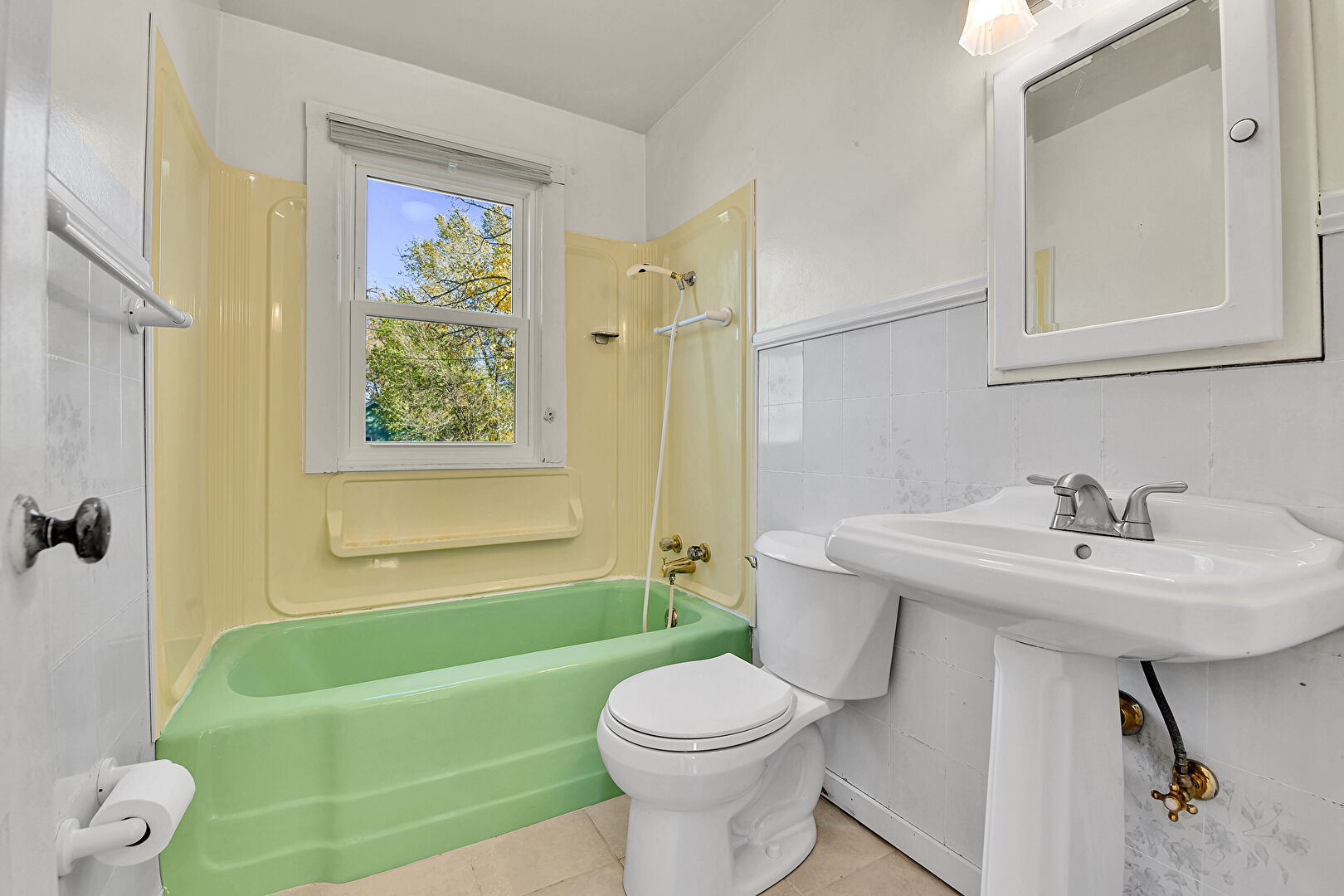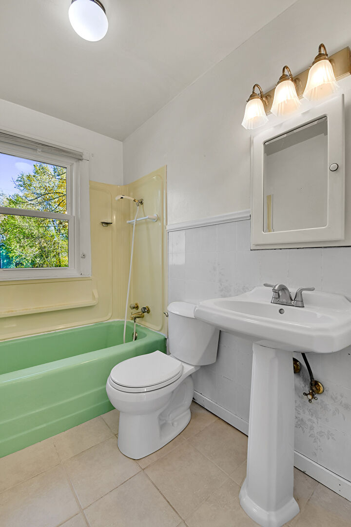 Combined Bath Shower, Drywall, Full Bathroom, Natural Light, Tile Floor, Tile Wall, Wainscot Wall, Drywall, Tile Wall