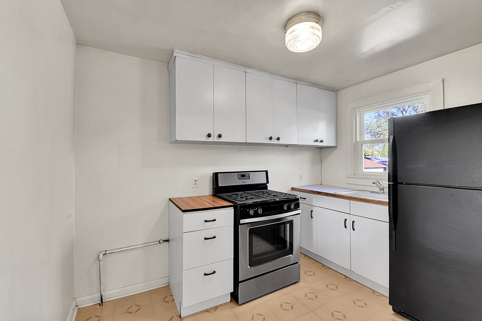 Arched Walkways, Baseboards Wall, Drywall, Natural Light, Vinyl Floor, Butcher Block Countertops, Natural Light