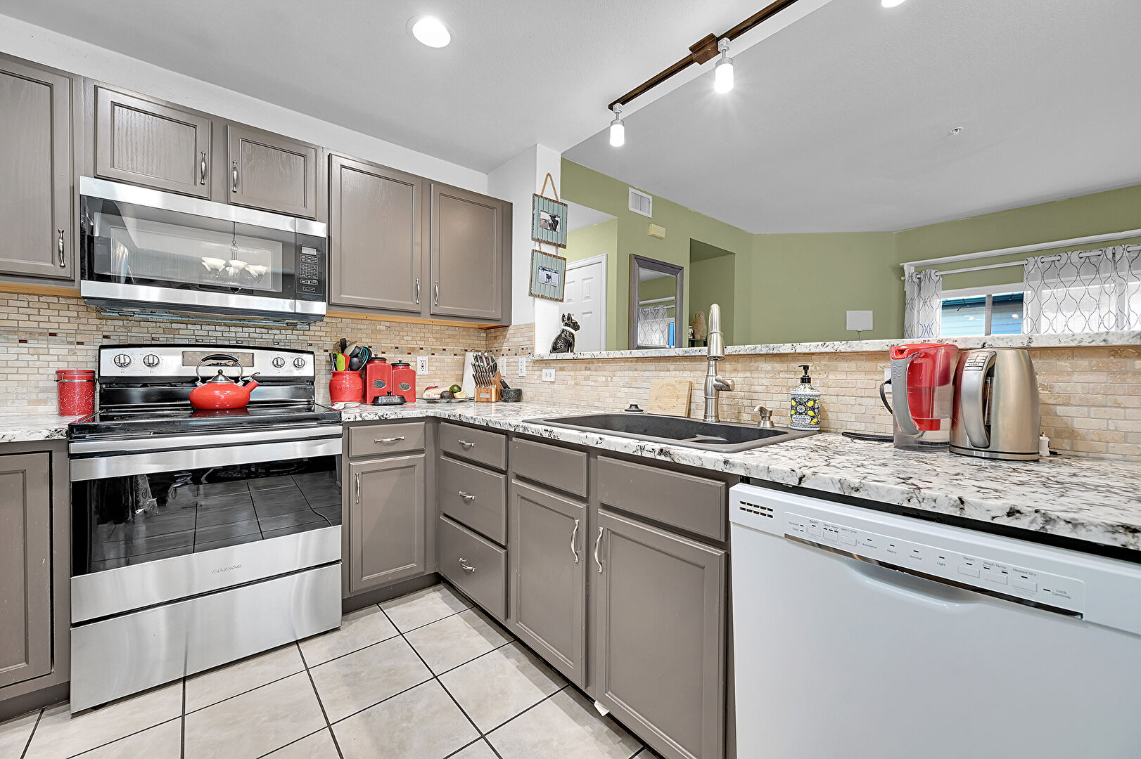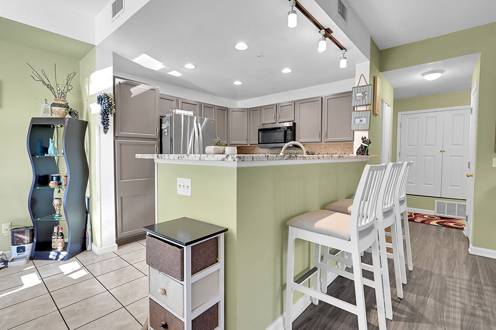 Baseboards Wall, Drywall, Gray Cabinets, Kitchen Bar, Kitchen Peninsula, Natural Light, Notable Chandelier, Pendant Lighting, Recessed Lighting, Shaker Cabinets, Stone Countertops, Tile Floor, Track Lighting, U Shaped Kitchen, Vaulted Ceiling, Vent, Wood Finish Floor, Kitchen Peninsula, Recessed Lighting, Shaker Cabinets, Stone Countertops
