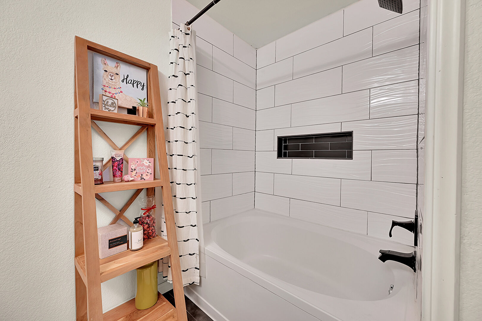 Baseboards Wall, Double Vanity, Ensuite Bathroom, Full Bathroom, Natural Light, Textured Wall, Tile Floor, Vanity, Vent, Wood Finish Floor, Baseboards Wall, Combined Bath Shower, Drywall, Tile Floor