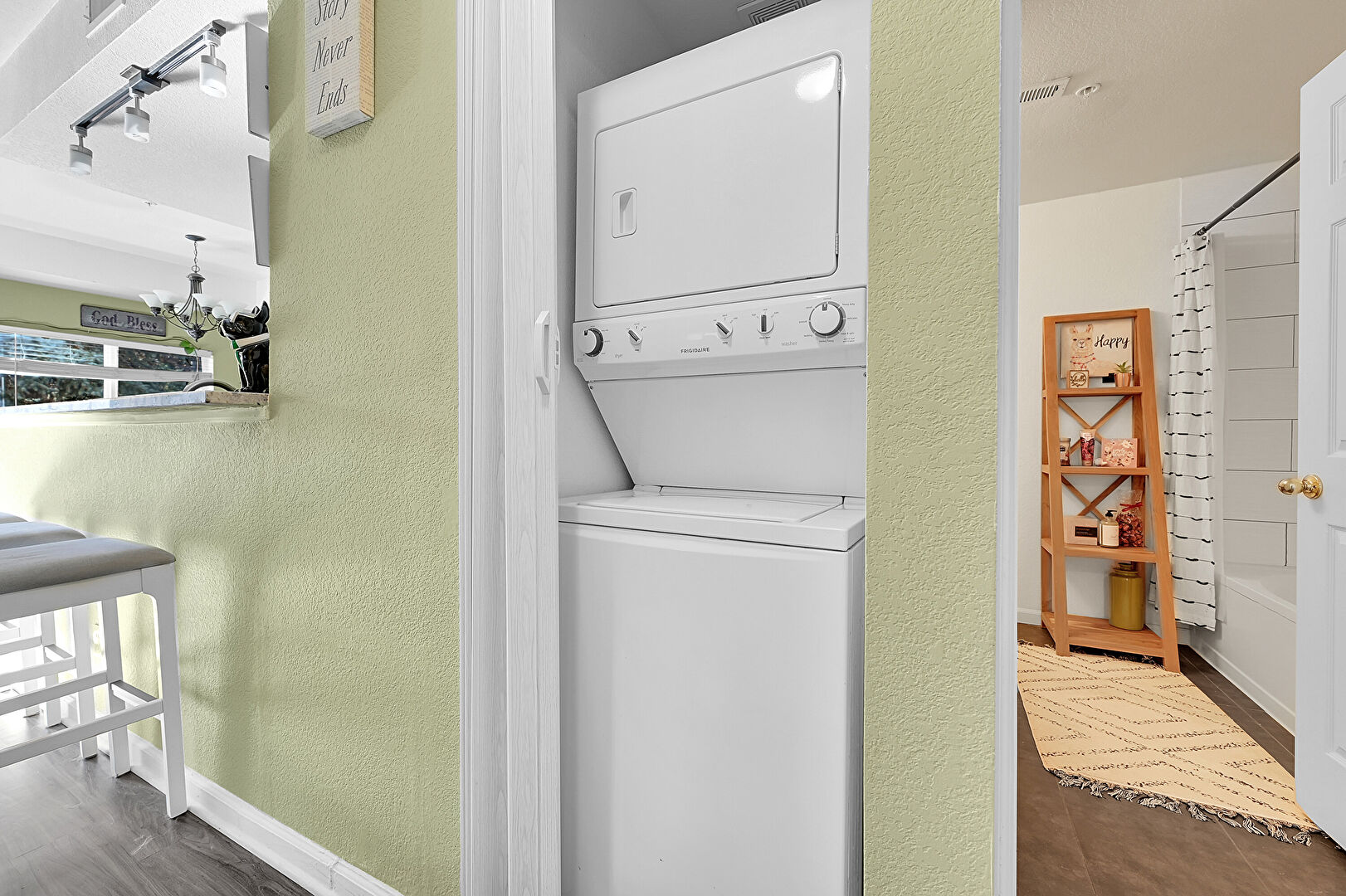 Baseboards Wall, Laundry, Natural Light, Notable Chandelier, Wood Finish Floor, Textured Wall
