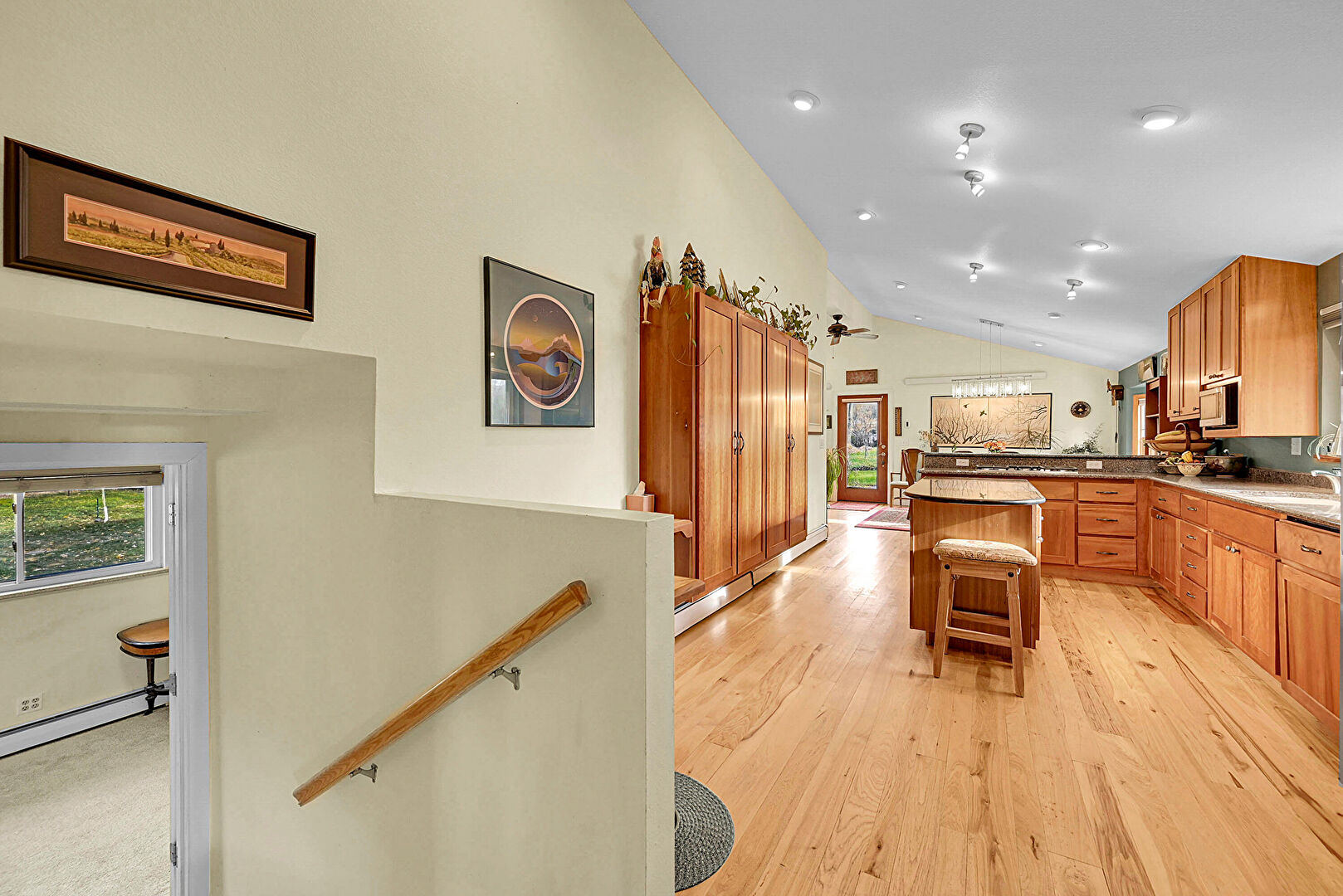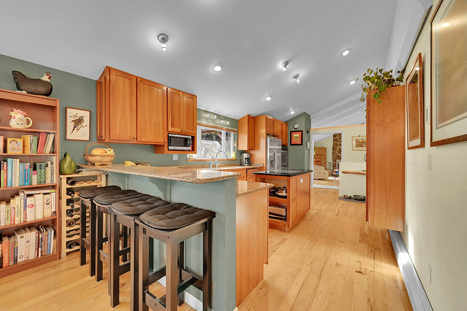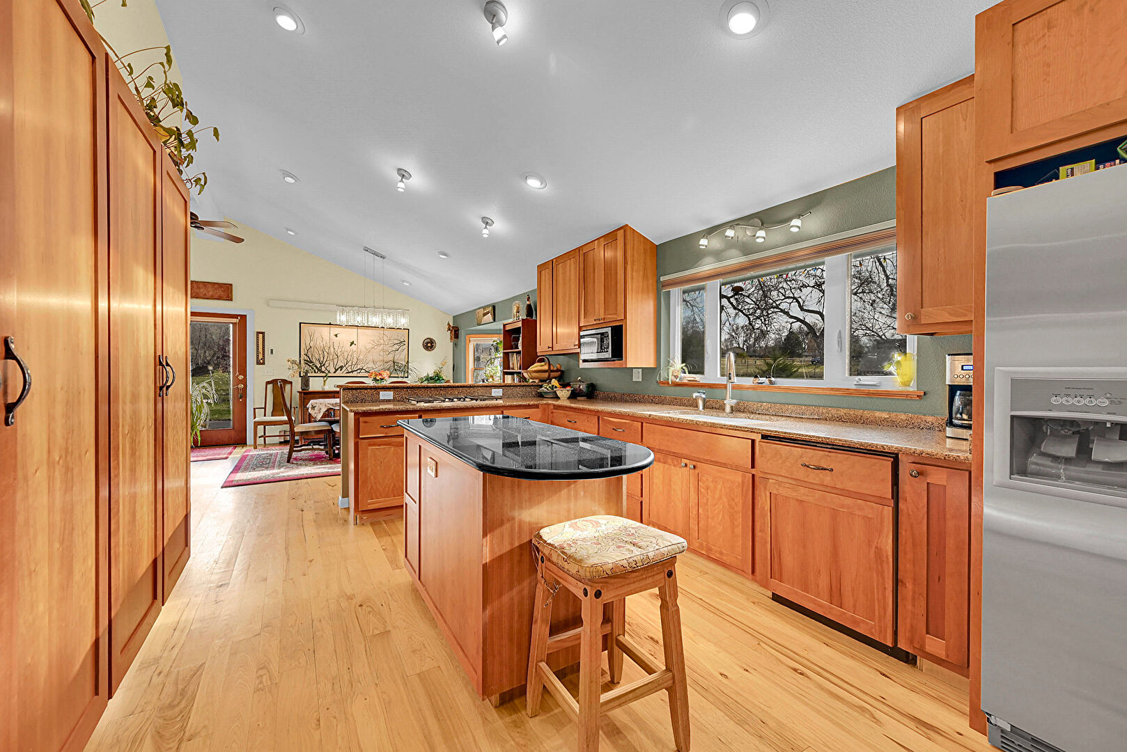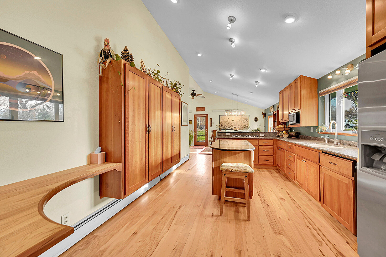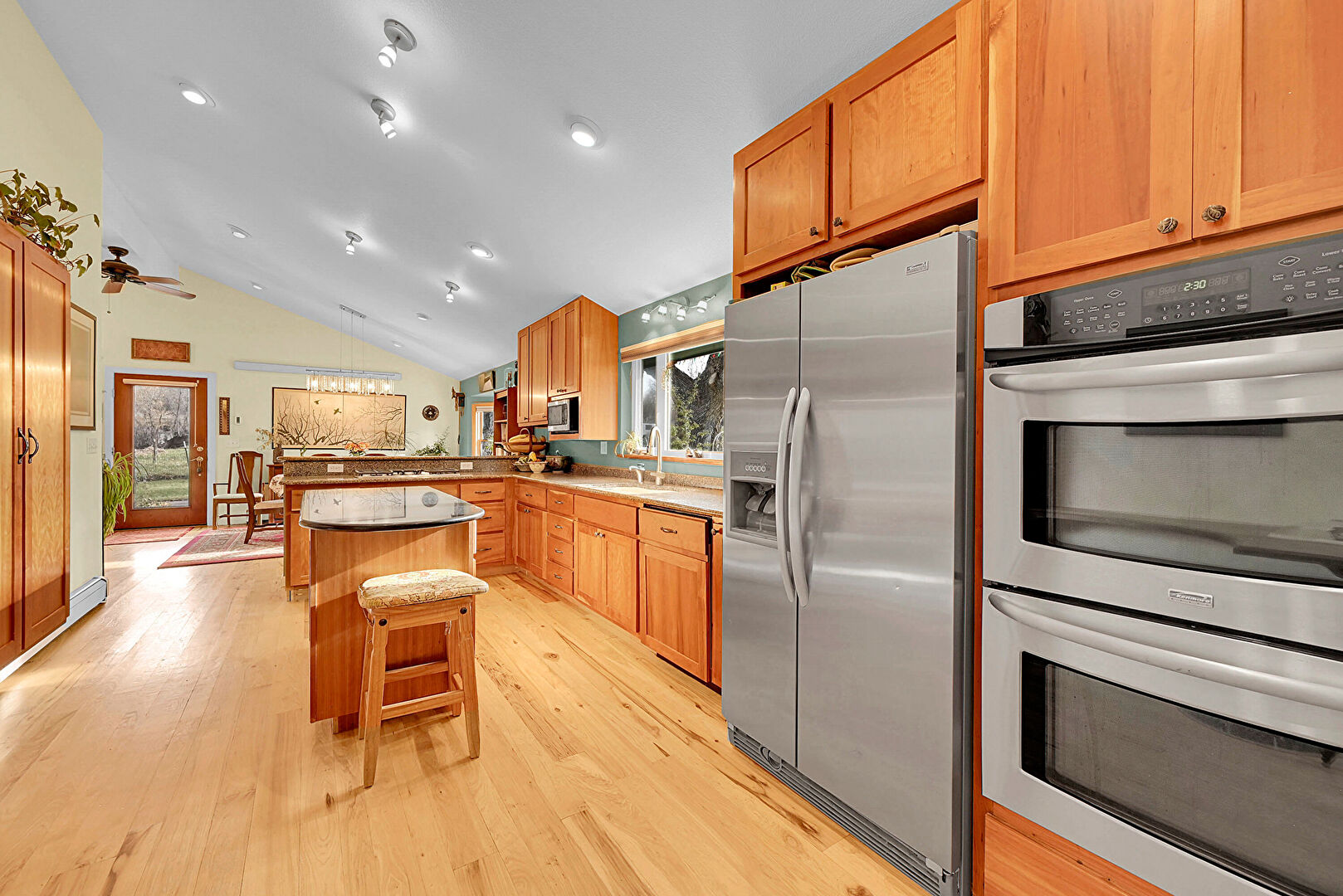 Baseboard Radiator, Baseboards Wall, Ceiling Fan, Double Oven, Drywall, High Ceiling, Kitchen Bar, Kitchen Island, Kitchen Peninsula, Medium Brown Cabinets, Natural Light, Open Shelves, Pendant Lighting, Recessed Lighting, Shaker Cabinets, Stone Countertops, U Shaped Kitchen, Vaulted Ceiling, Wood Finish Floor, Drywall, Kitchen Bar, Kitchen Island, Kitchen Peninsula, Natural Light, Shaker Cabinets, Stone Countertops, Vaulted Ceiling