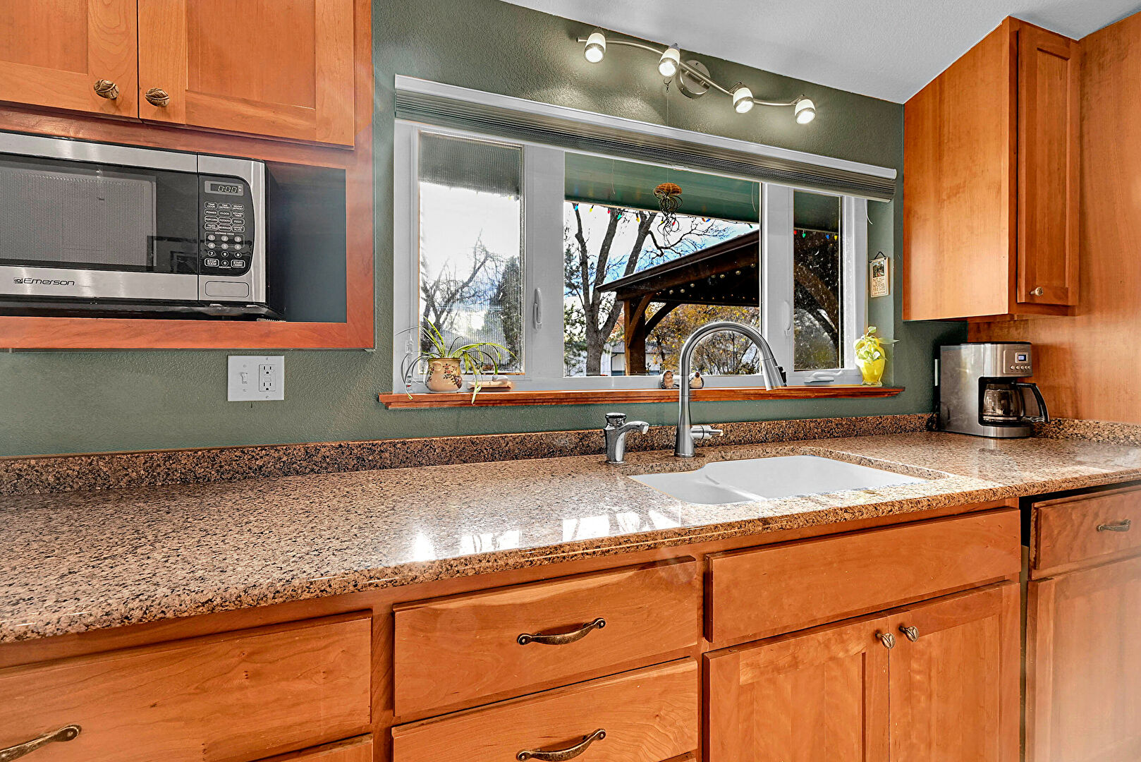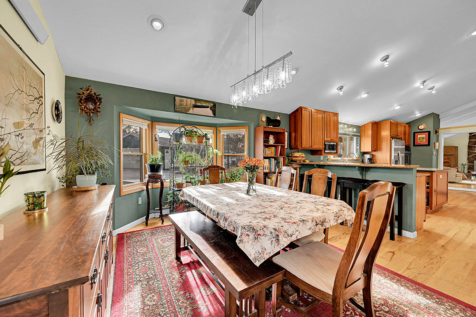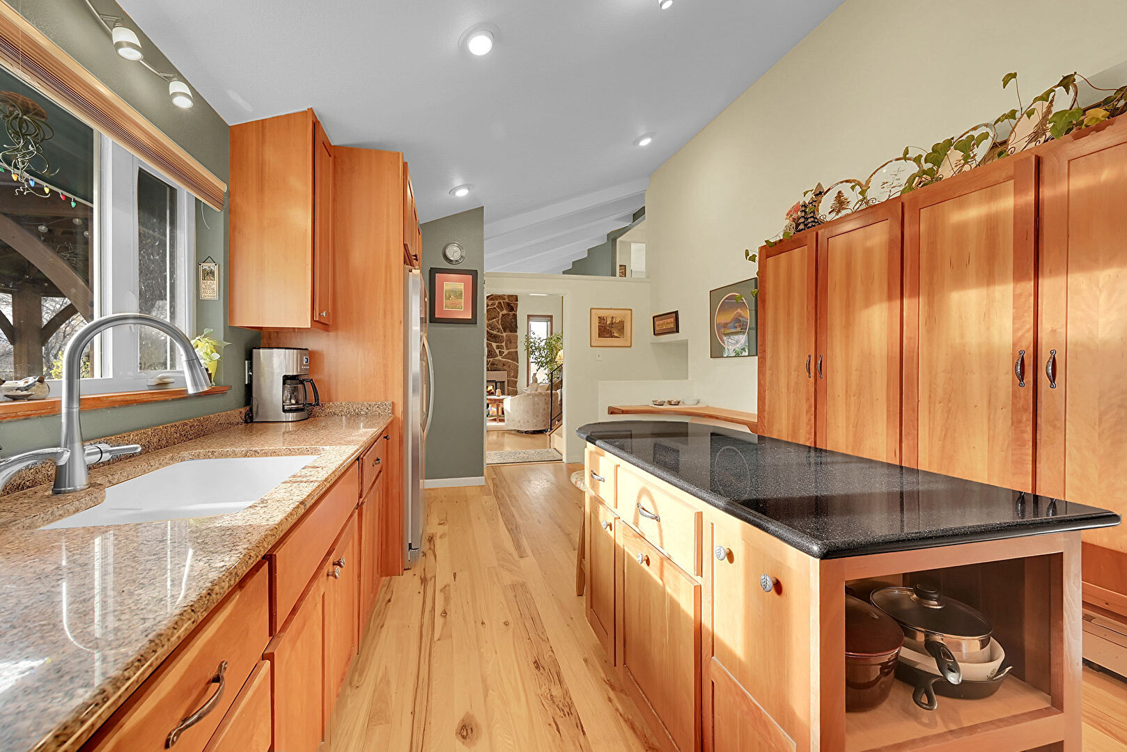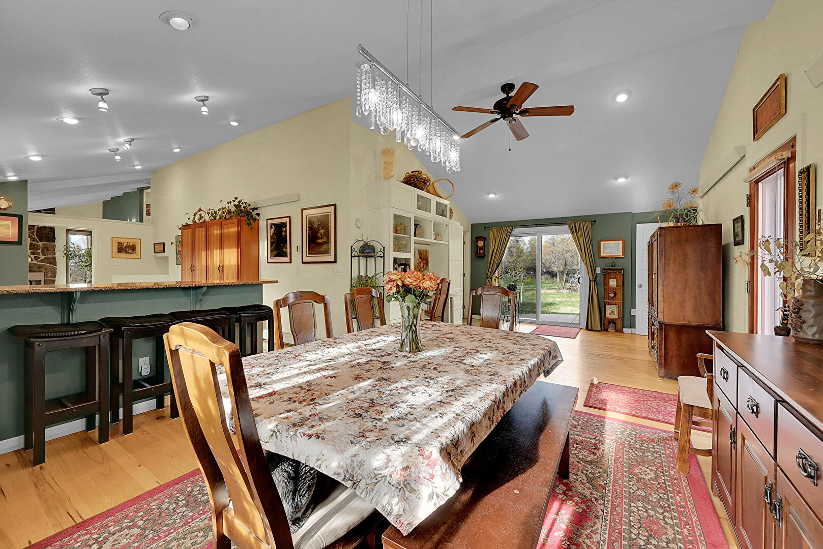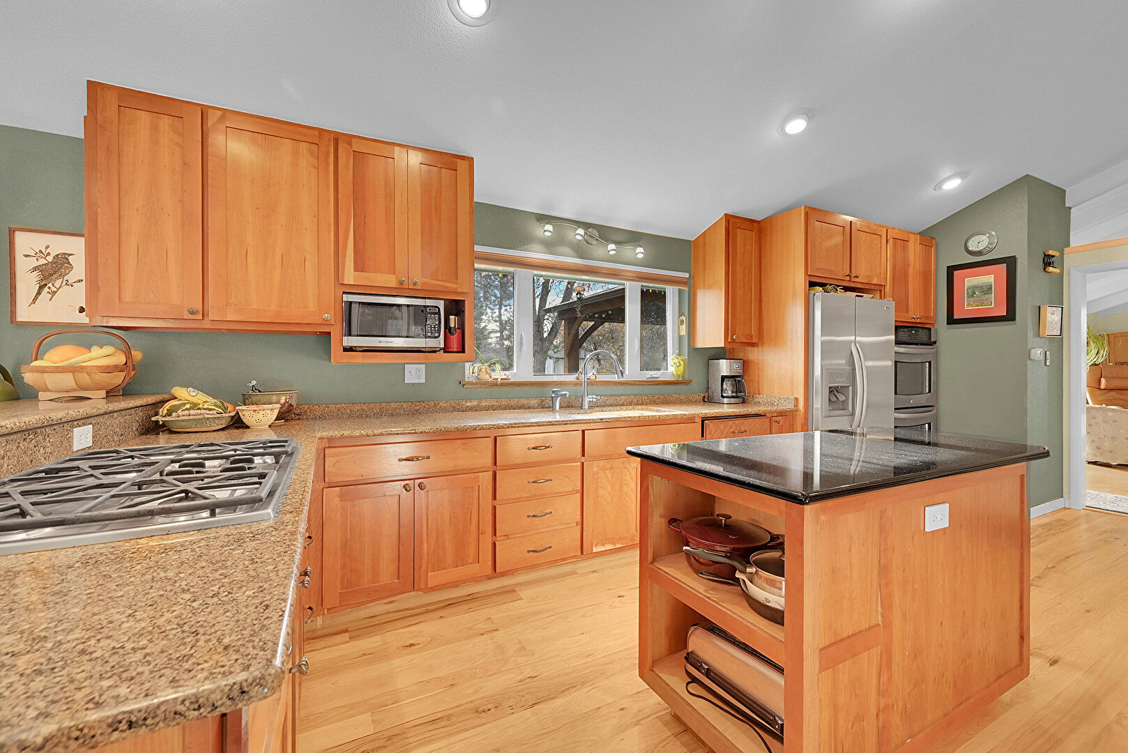 Baseboard Radiator, Baseboards Wall, Ceiling Fan, Double Oven, Drywall, High Ceiling, Kitchen Bar, Kitchen Island, Kitchen Peninsula, Medium Brown Cabinets, Natural Light, Open Shelves, Pendant Lighting, Recessed Lighting, Shaker Cabinets, Stone Countertops, U Shaped Kitchen, Vaulted Ceiling, Wood Finish Floor, Drywall, Kitchen Bar, Kitchen Island, Kitchen Peninsula, Natural Light, Shaker Cabinets, Stone Countertops, Vaulted Ceiling